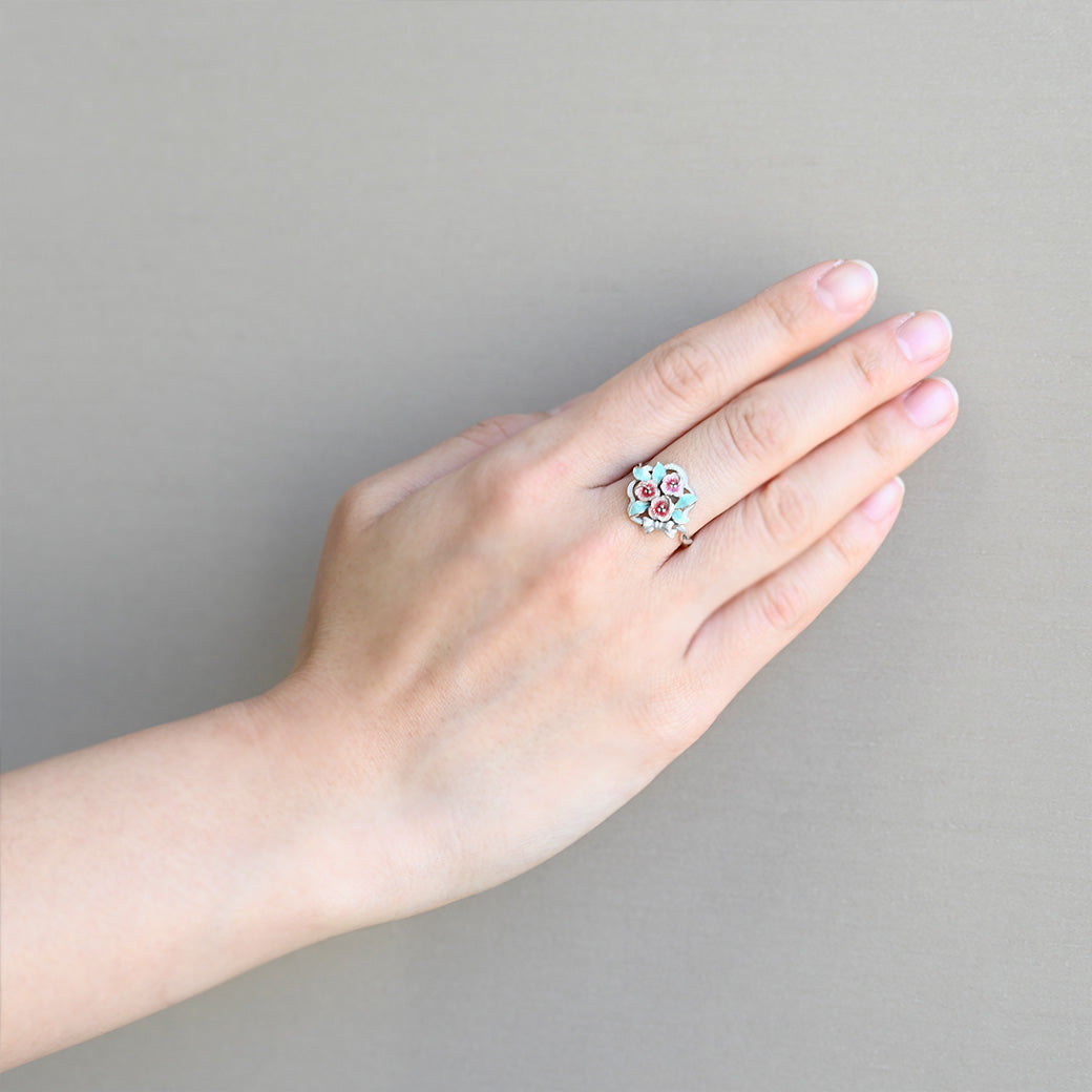 可憐なピンクのバラを花束にした、愛らしいリングです。ふんわりとした白いリボンがアクセントになり、エナメル仕上げの輝きが上品さを引き立てます。シルバー素材のエレガントな雰囲気が、大人の女性の指元を美しく彩ります。