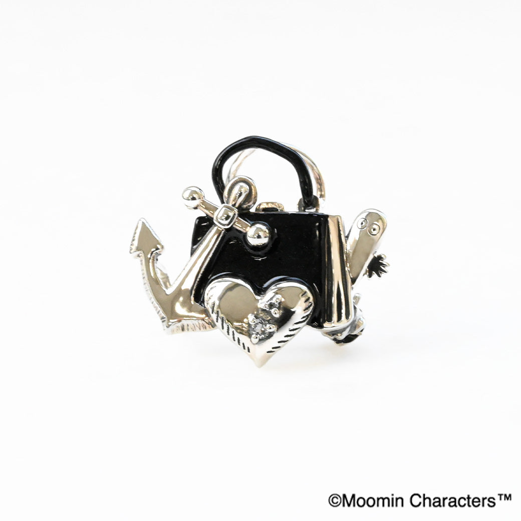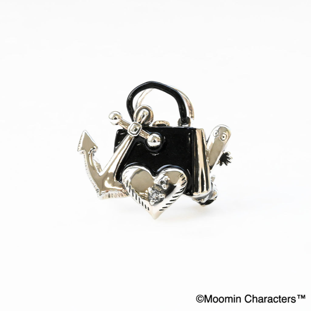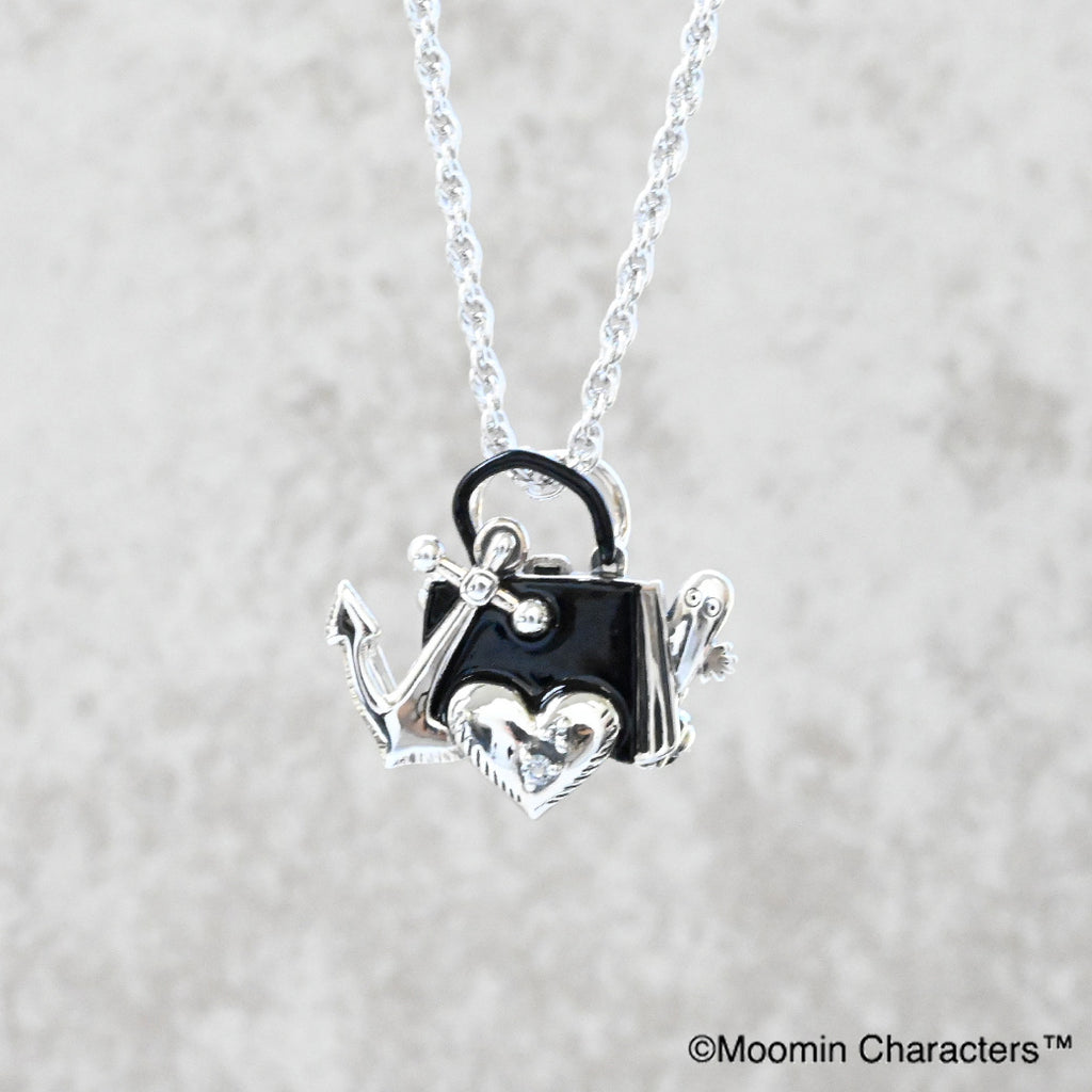 冒険の仲間たちと共に、ムーミンパパは船「海のオーケストラ号」に乗って旅を続け、さらに冒険の途中でたくさんの出来事に遭遇する様子が描かれています。そして、ついにムーミンパパはムーミンママと出会います。出会いのきっかけとなったムーミンママのバッグをモチーフに黒エナメル仕上げ、ニョロニョロと錨、ハートがぎゅっと集まった、とてもかわいらしいブローチペンダントです。