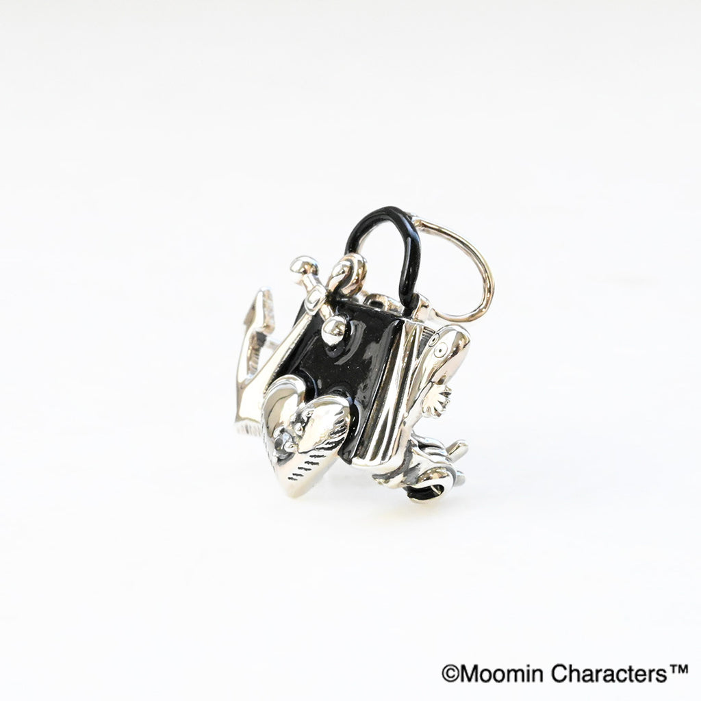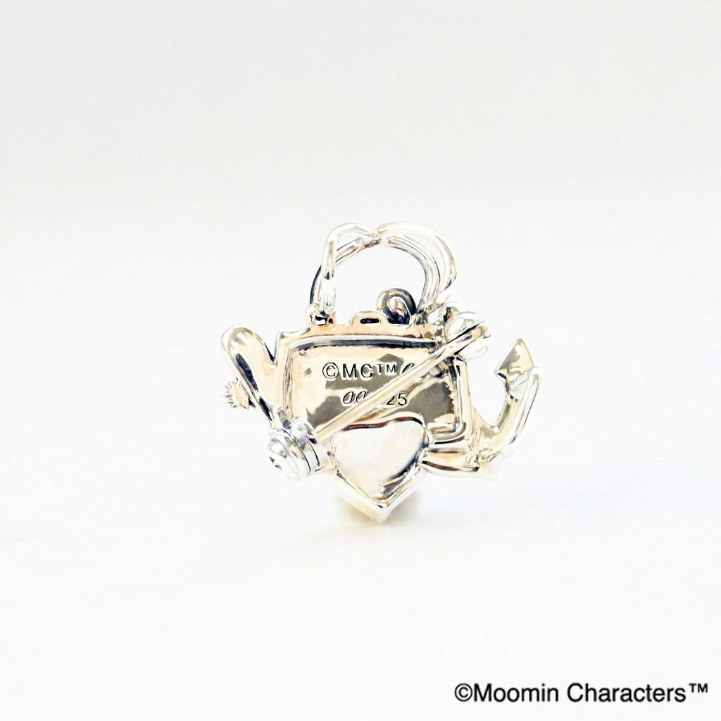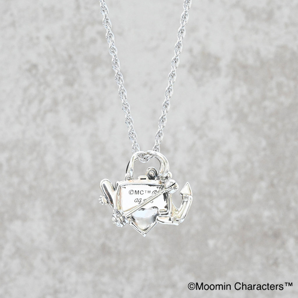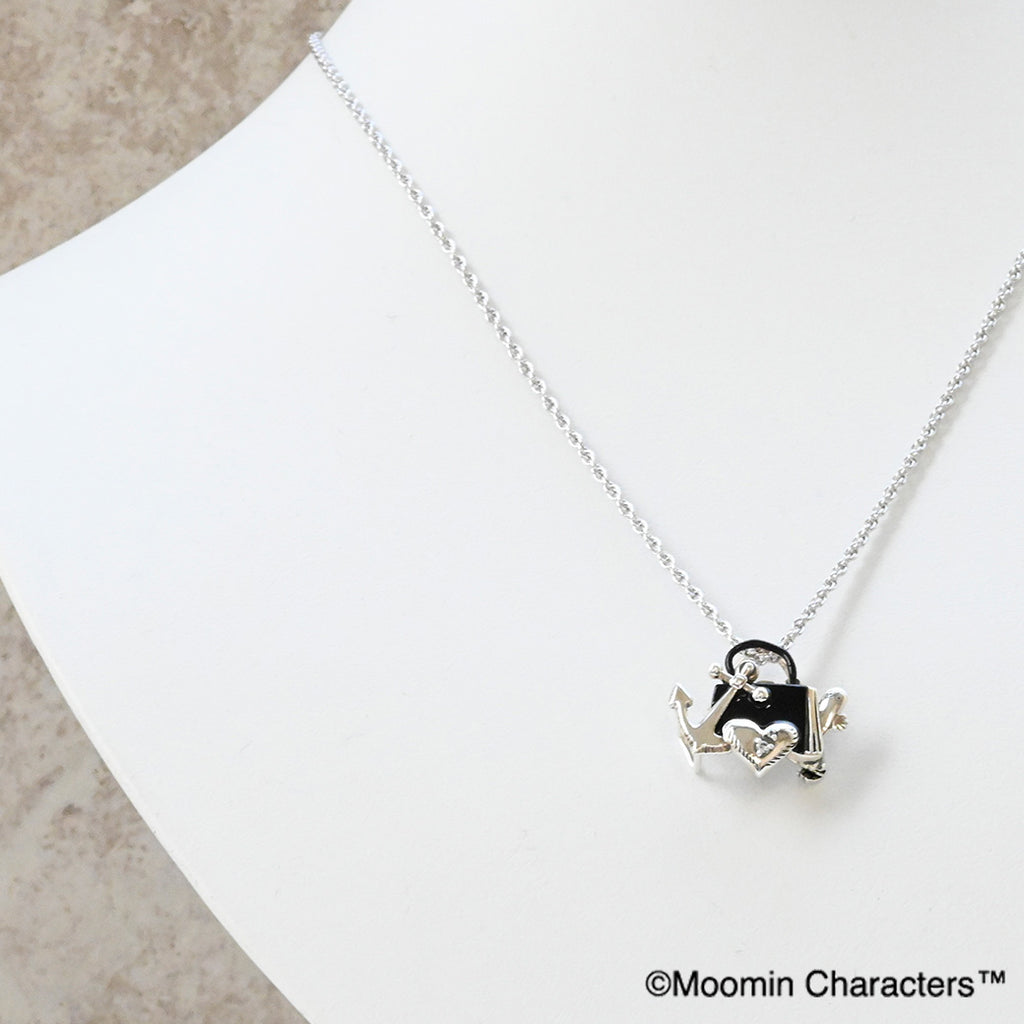 冒険の仲間たちと共に、ムーミンパパは船「海のオーケストラ号」に乗って旅を続け、さらに冒険の途中でたくさんの出来事に遭遇する様子が描かれています。そして、ついにムーミンパパはムーミンママと出会います。出会いのきっかけとなったムーミンママのバッグをモチーフに黒エナメル仕上げ、ニョロニョロと錨、ハートがぎゅっと集まった、とてもかわいらしいブローチペンダントです。