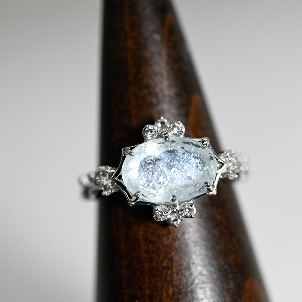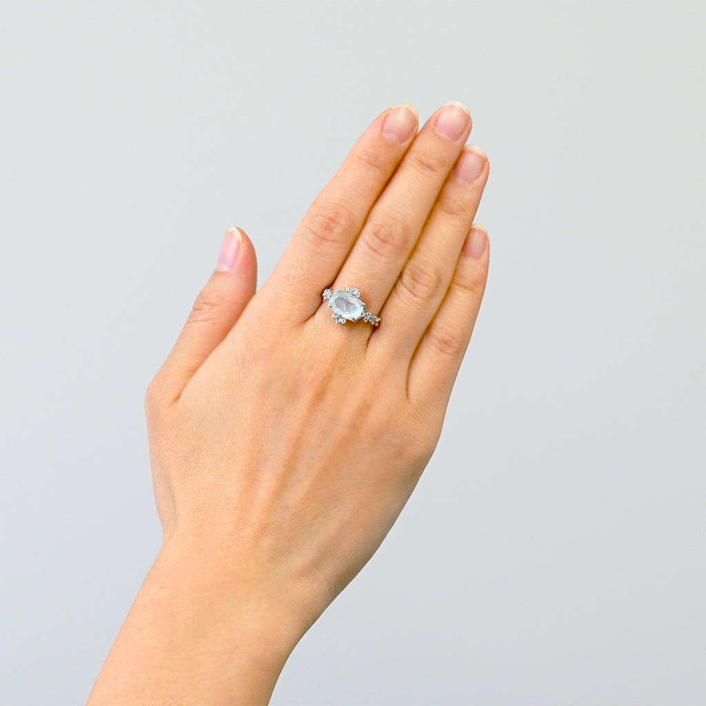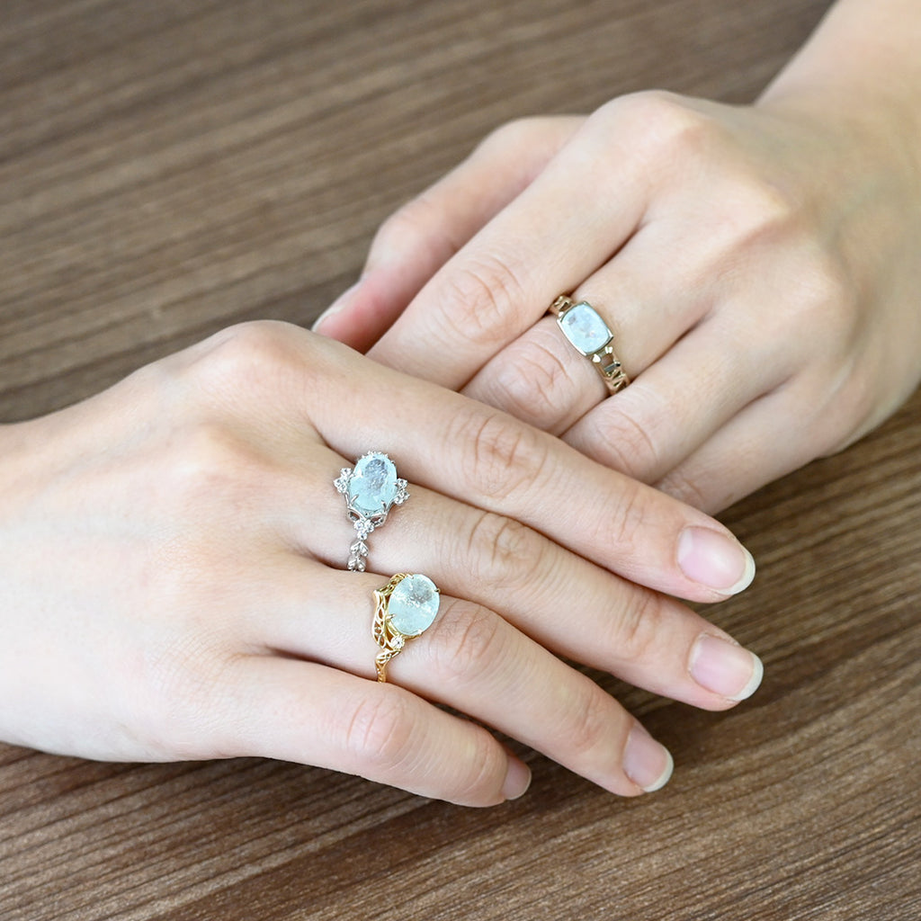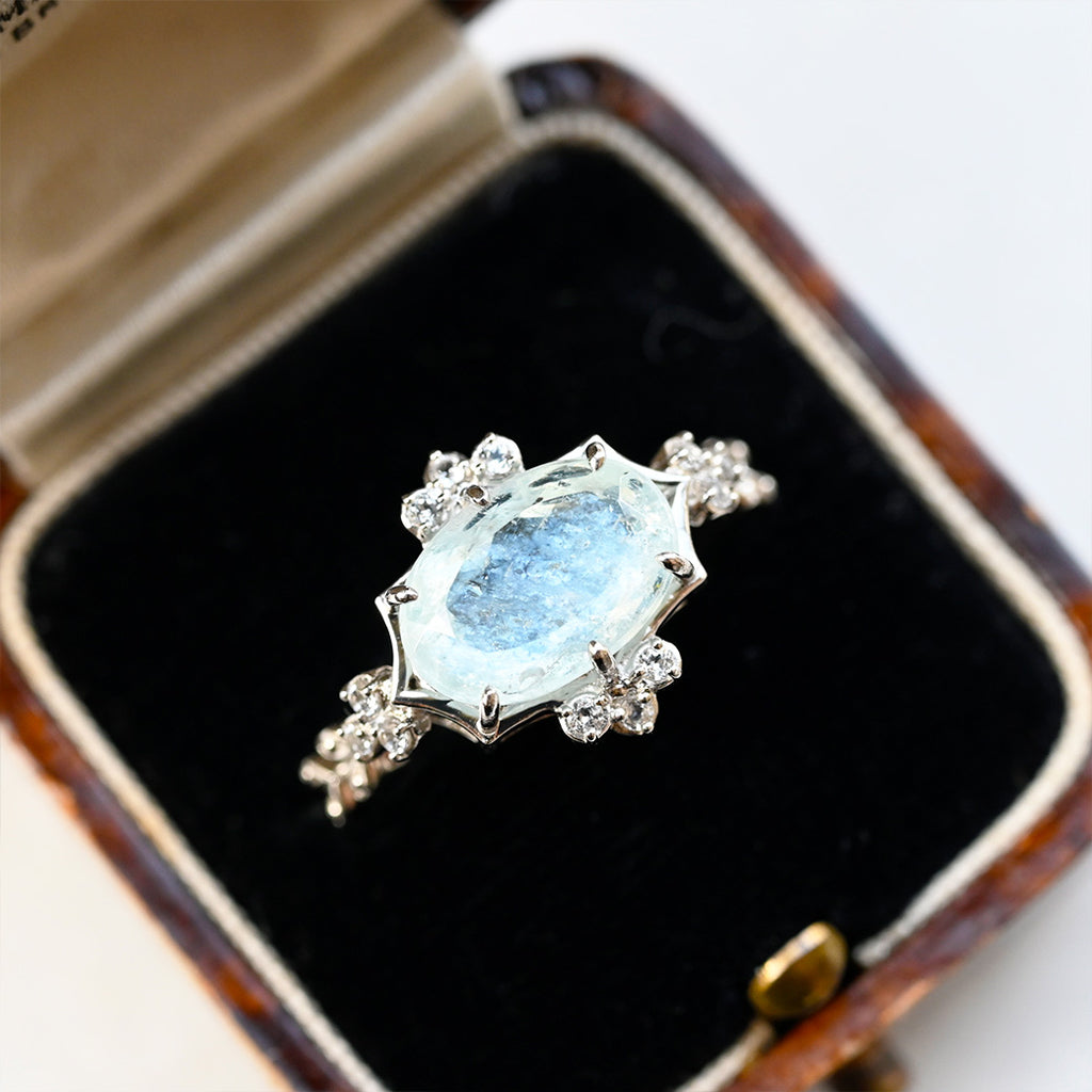 まるで朝露が差し込む光を映すように──このリングのセンターには、淡いブルーと微細な煌めきが幻想的に揺らめく「シンデレラアクアマリン」をセッティング。透明度の高い天然アクアマリンの中に、光の粒が舞うような美しさをたたえています。
