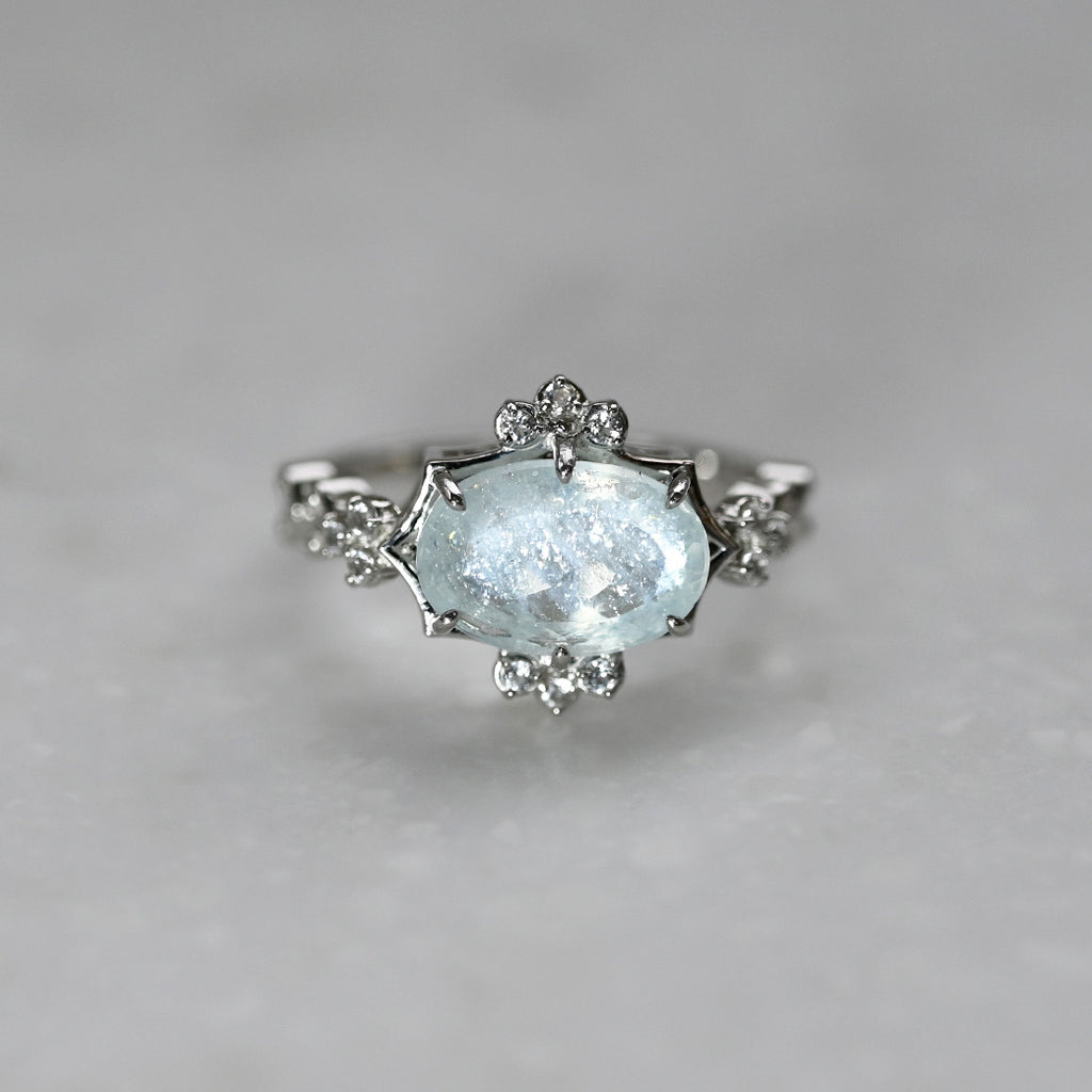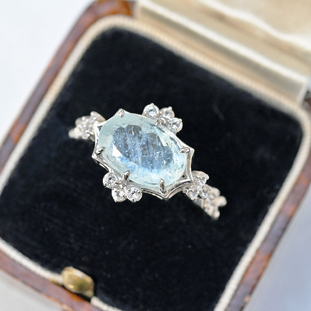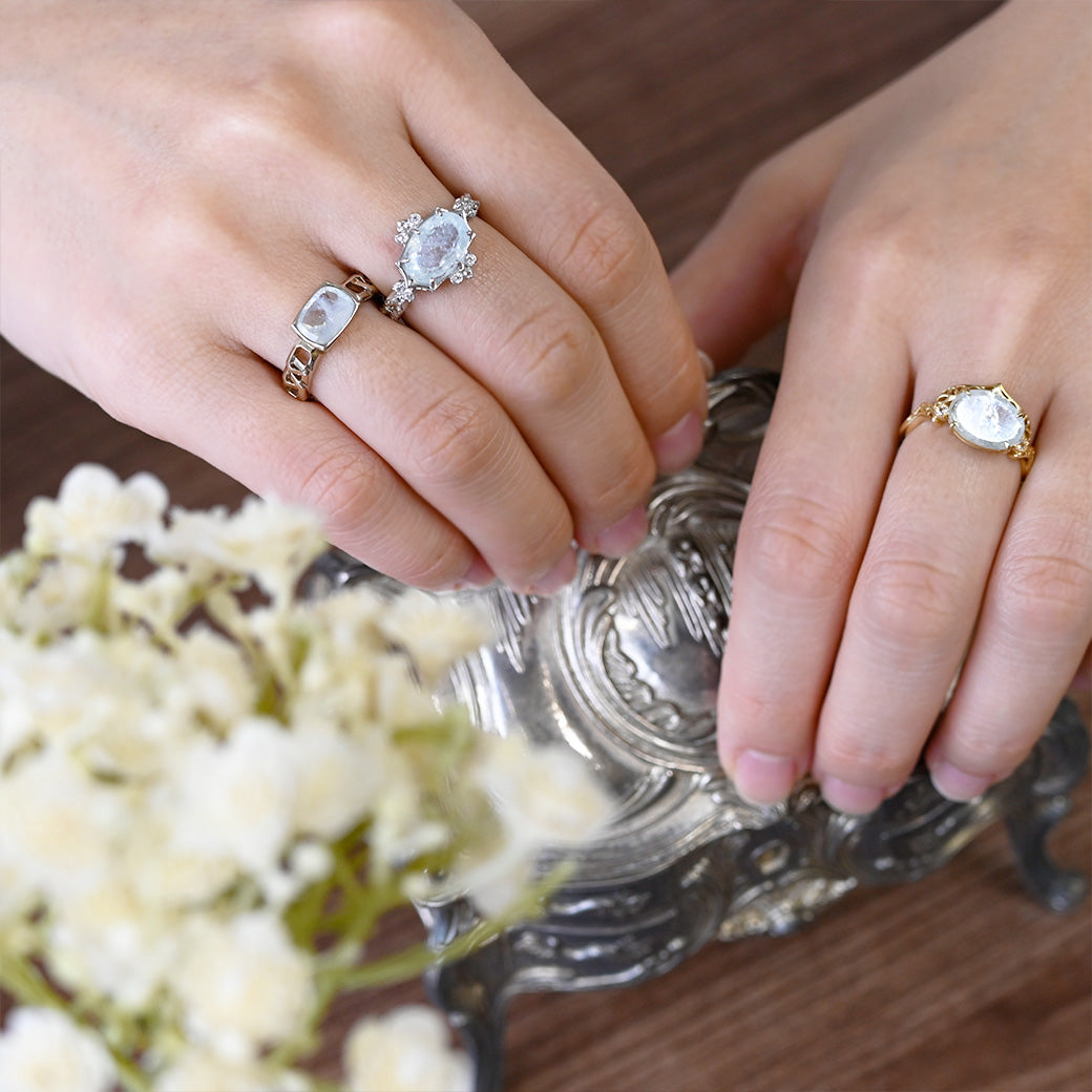 まるで朝露が差し込む光を映すように──このリングのセンターには、淡いブルーと微細な煌めきが幻想的に揺らめく「シンデレラアクアマリン」をセッティング。透明度の高い天然アクアマリンの中に、光の粒が舞うような美しさをたたえています。