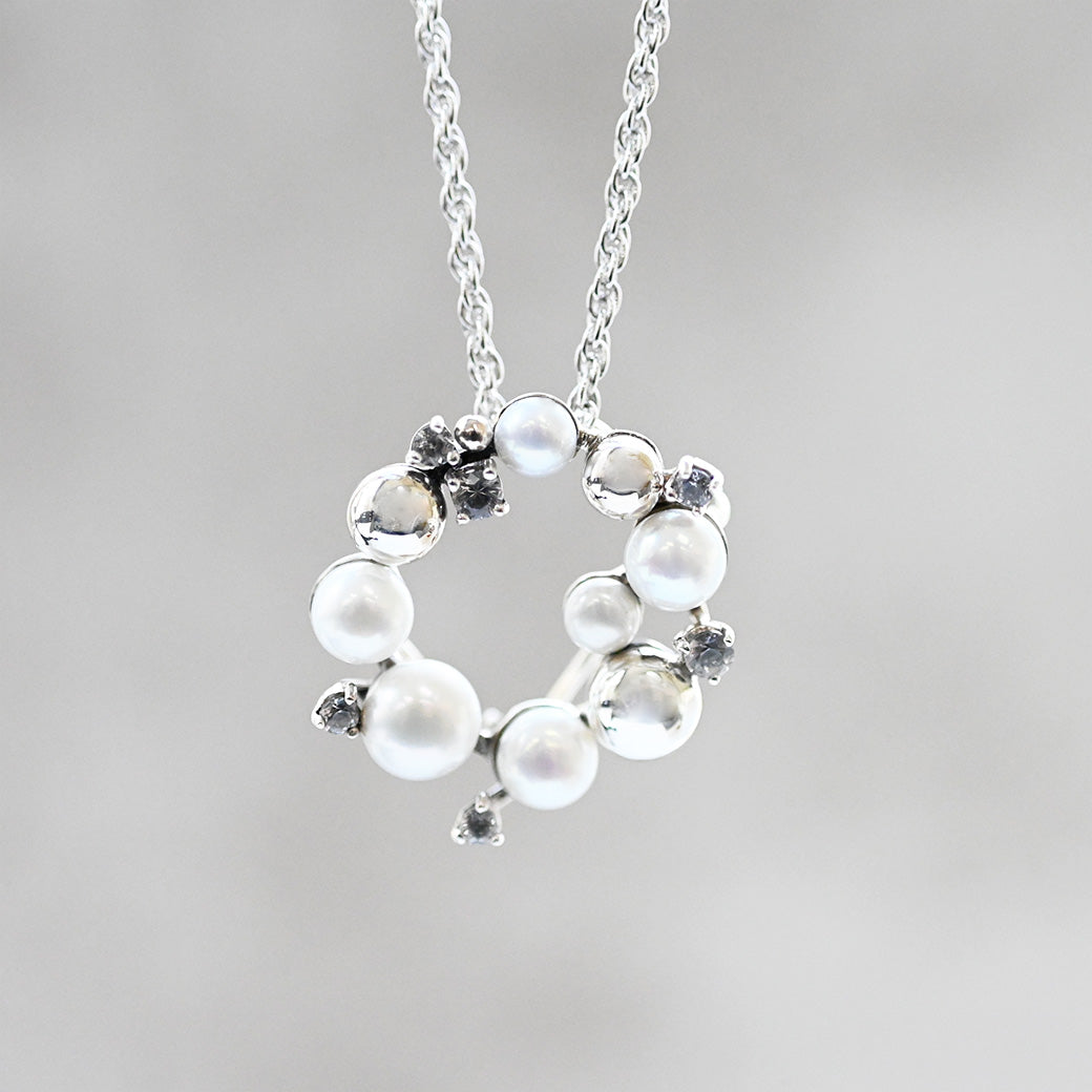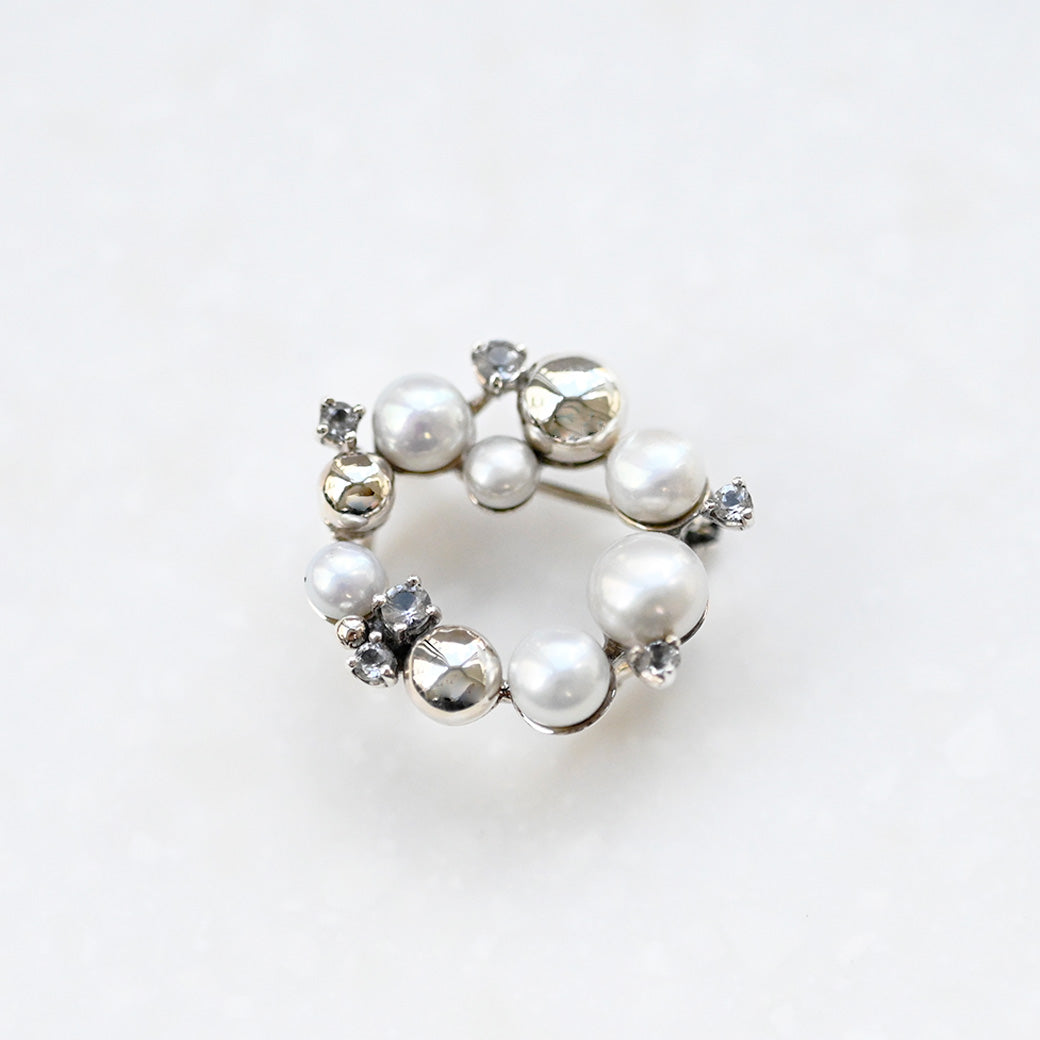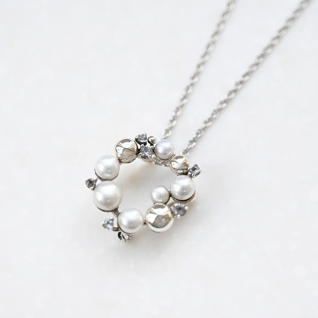 まるで夜空に浮かぶ月のしずくを集めたような、優美なサークルモチーフのブローチペンダント。大小さまざまなパールの柔らかな光沢と、ホワイトトパーズの透明感のある輝きが、シルバーのフレームに軽やかに並び、上品でありながら遊び心も感じさせるデザインです。