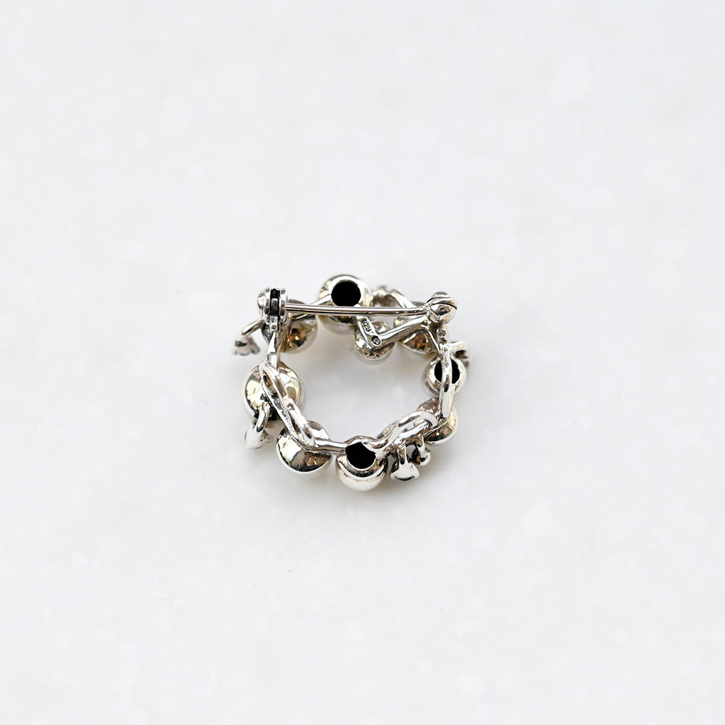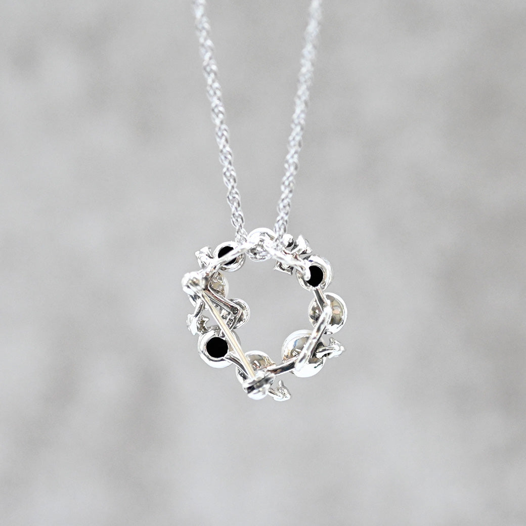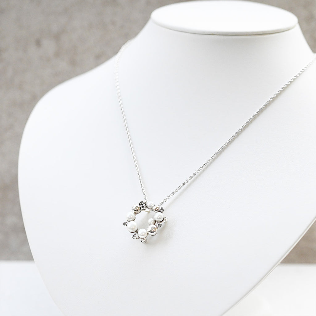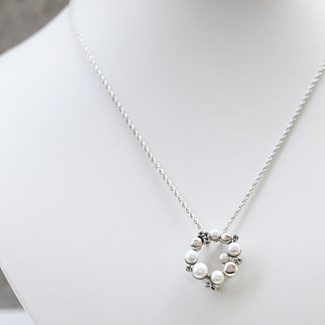 まるで夜空に浮かぶ月のしずくを集めたような、優美なサークルモチーフのブローチペンダント。大小さまざまなパールの柔らかな光沢と、ホワイトトパーズの透明感のある輝きが、シルバーのフレームに軽やかに並び、上品でありながら遊び心も感じさせるデザインです。
