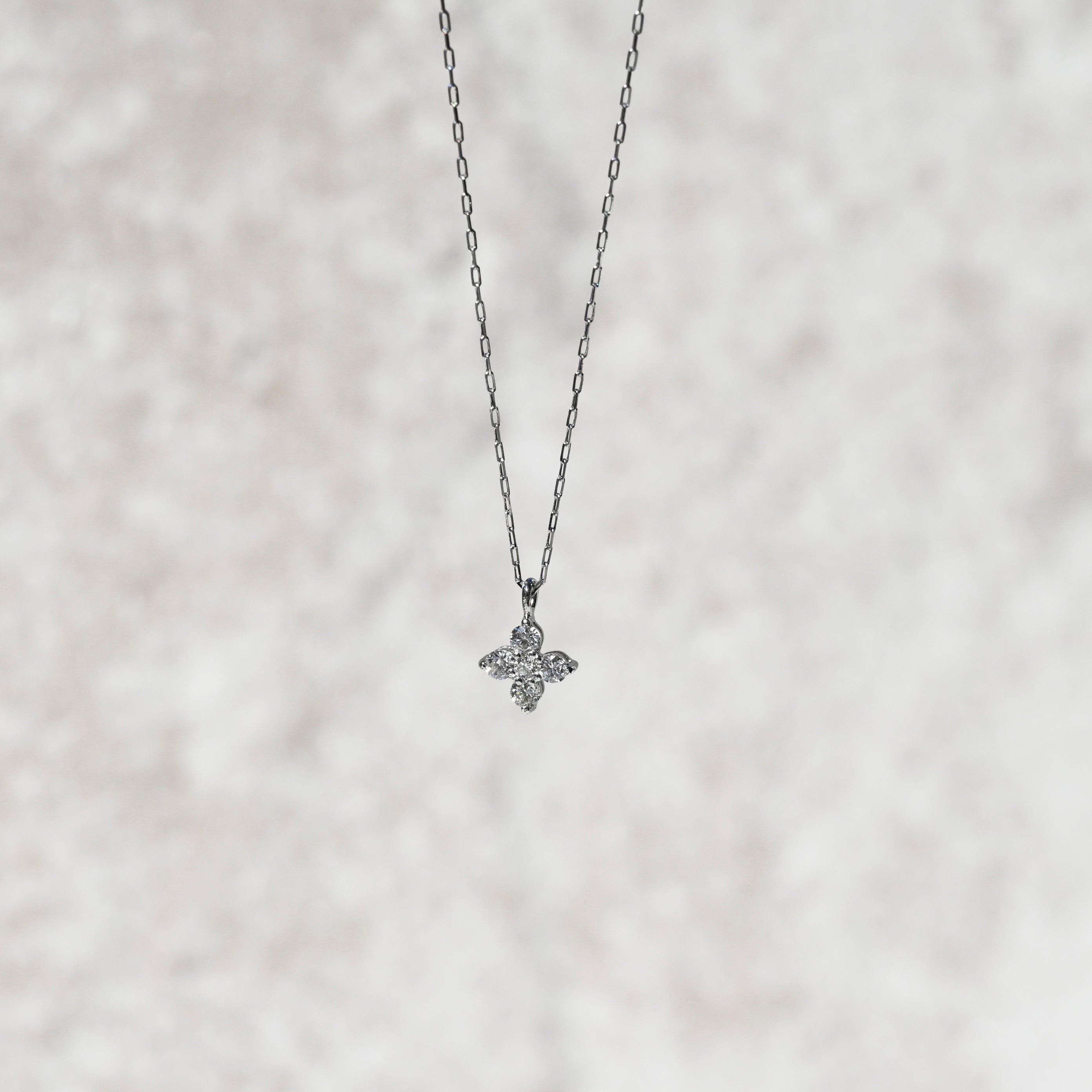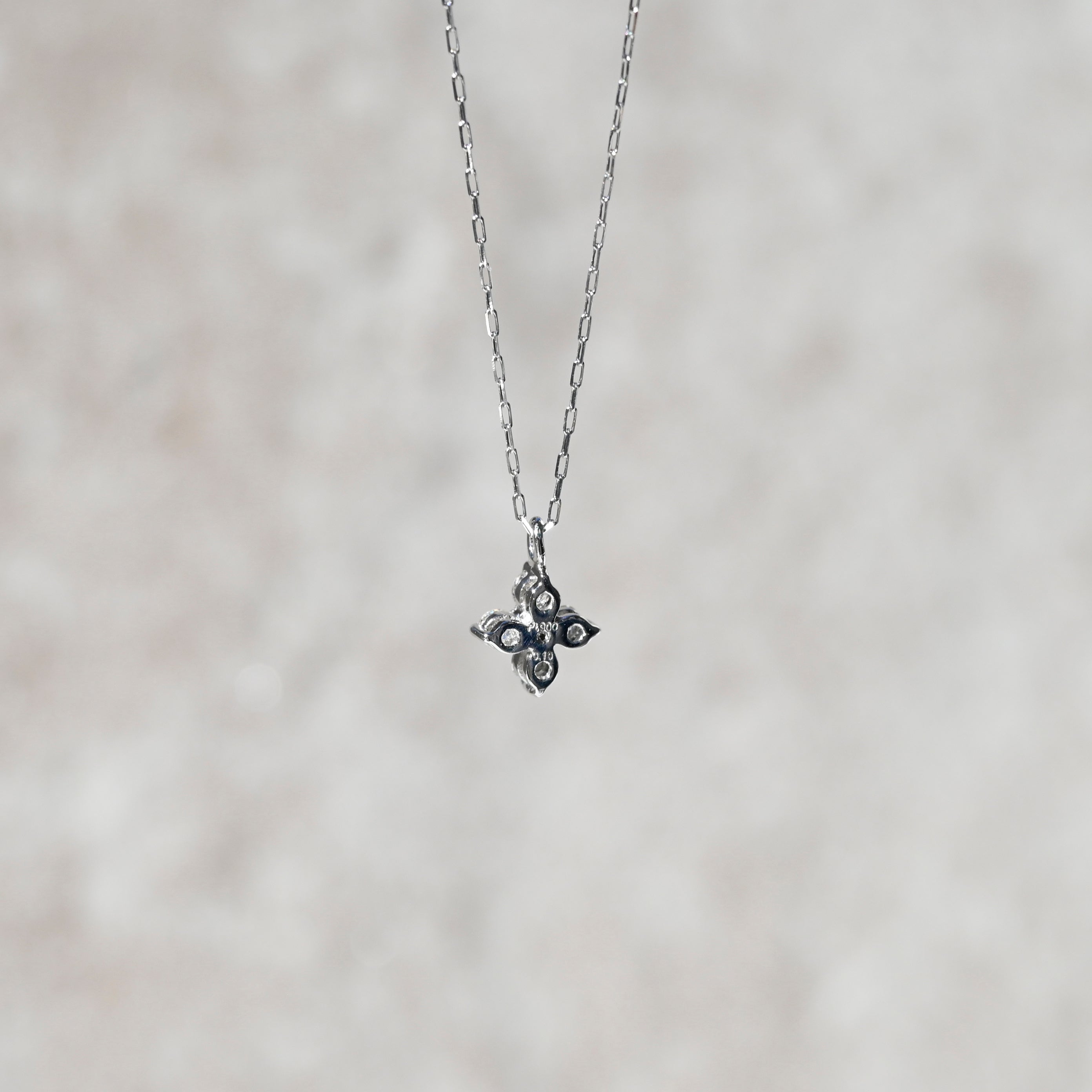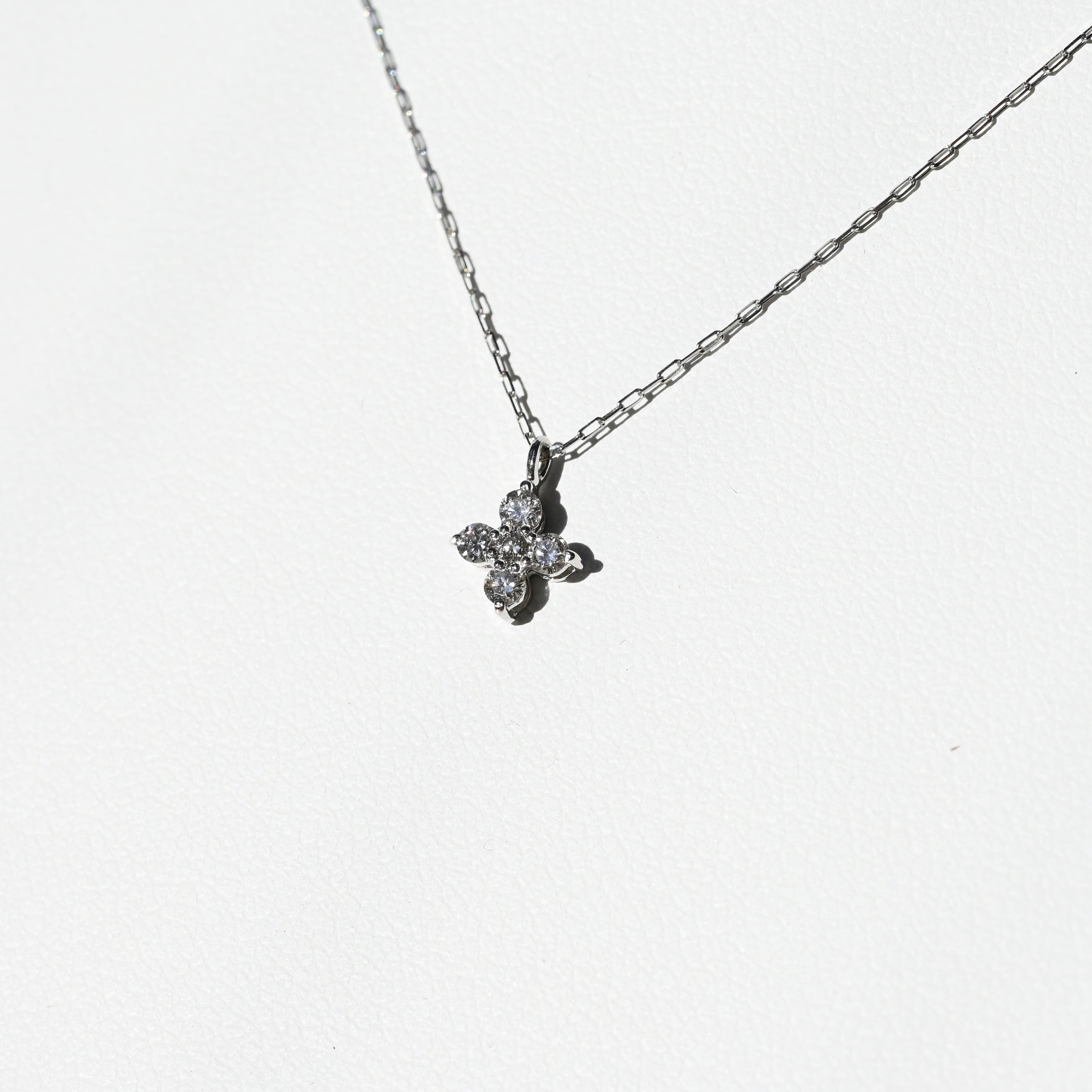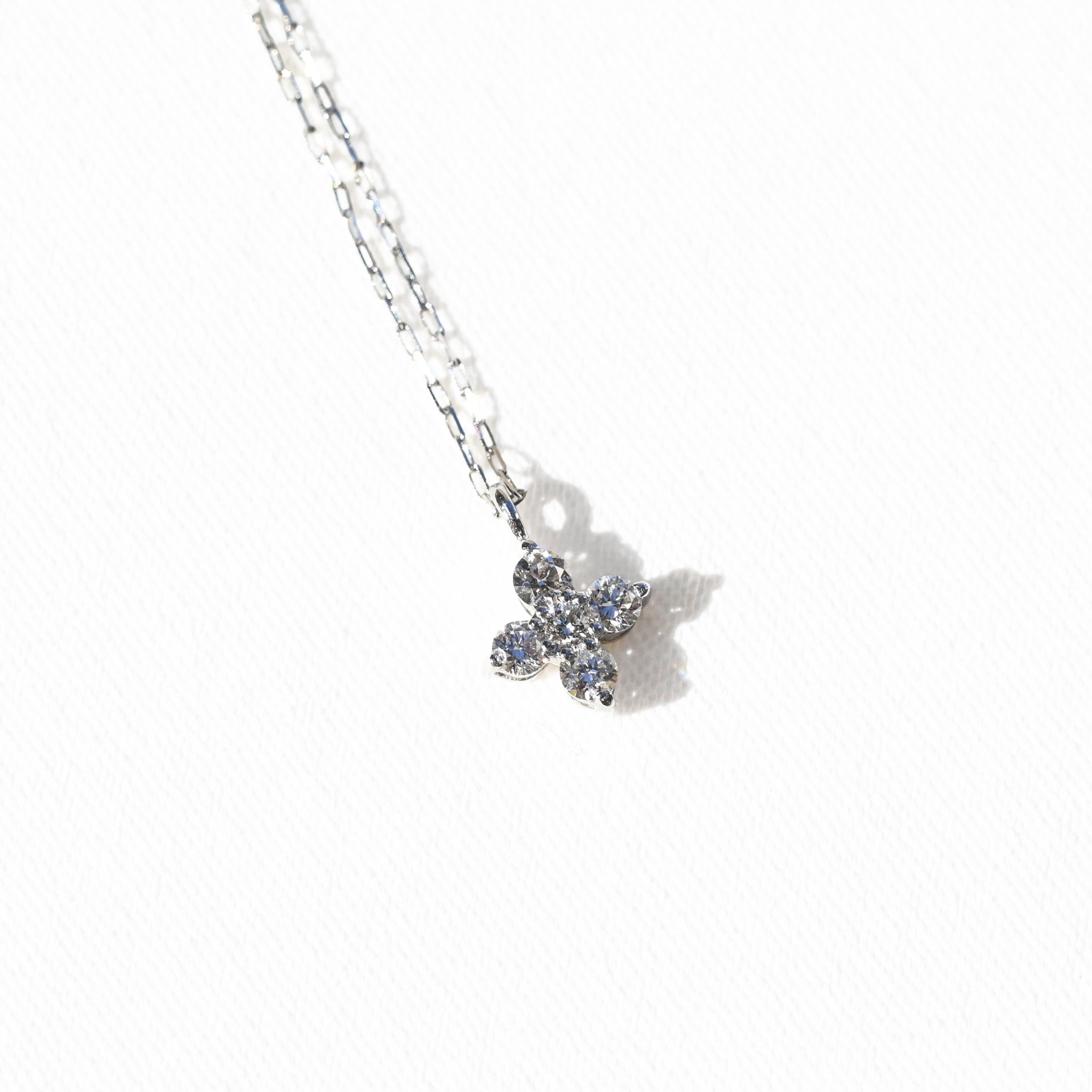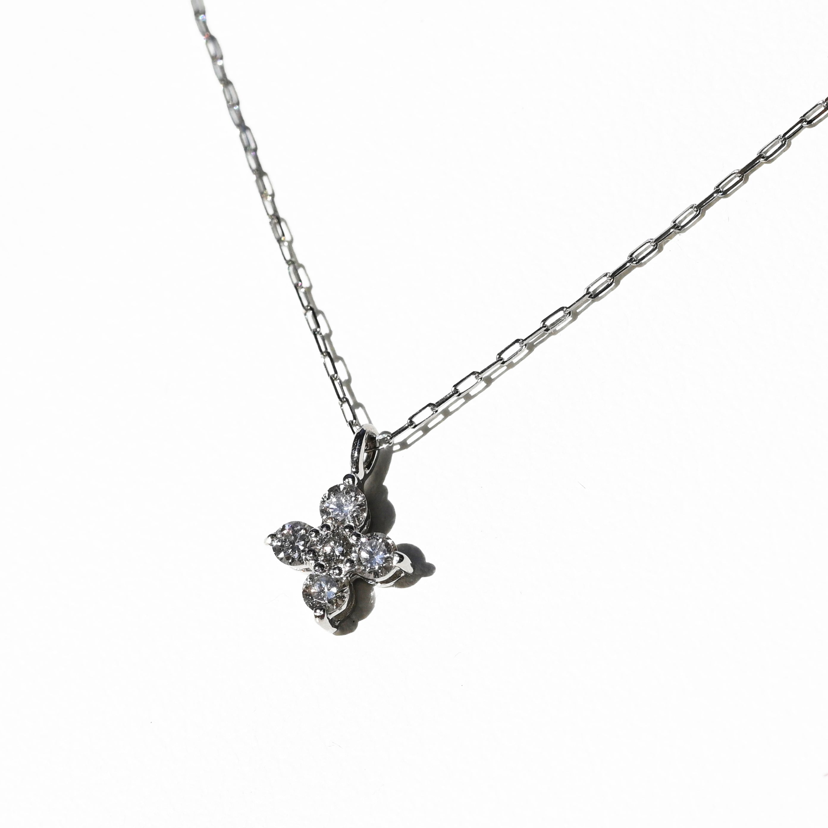 プラチナの凛とした輝きと、繊細な天然ダイヤモンドを組み合わせたフラワーモチーフのペンダント。5石のダイヤモンドを美しく配置し、上品で立体感のある花のシルエットを表現しています。