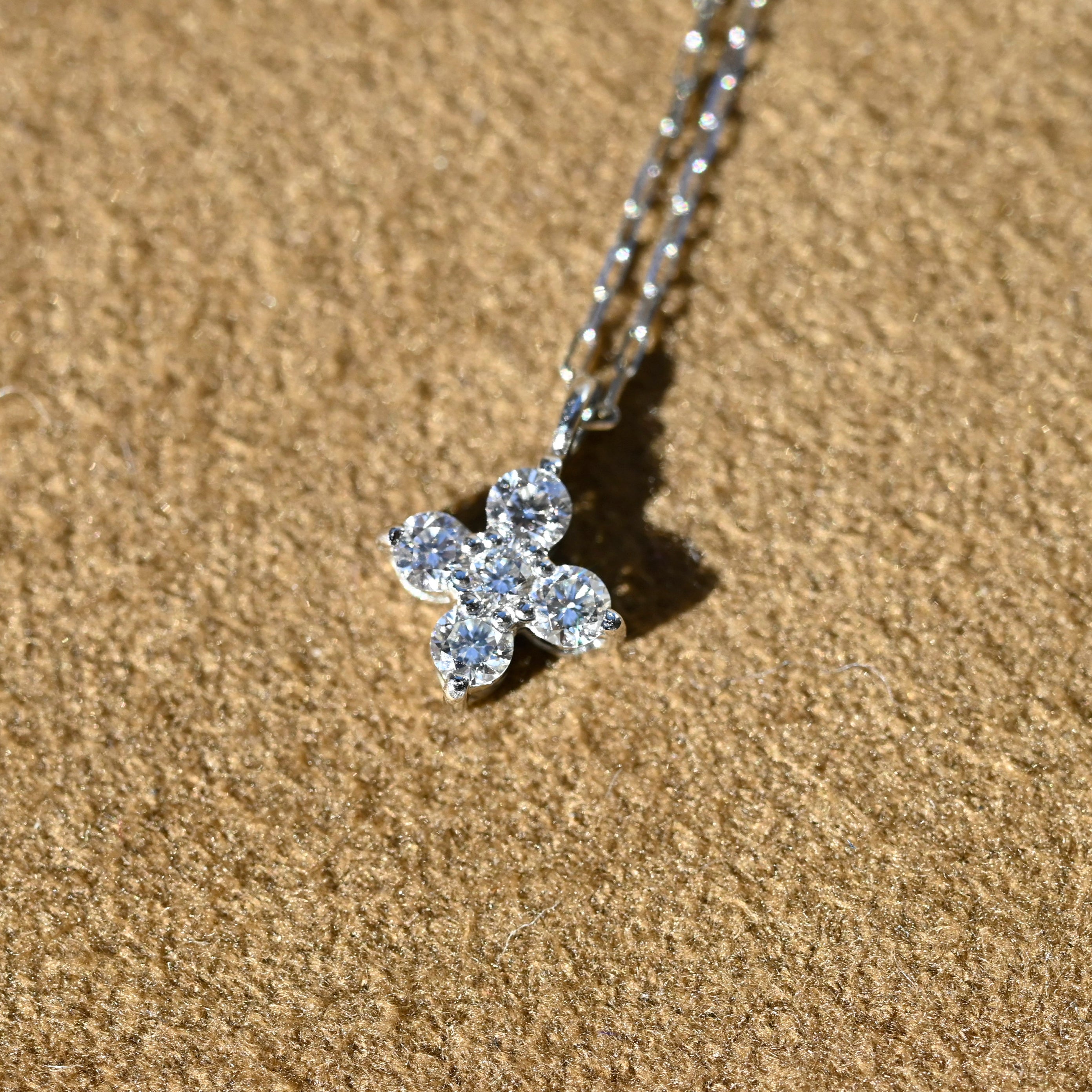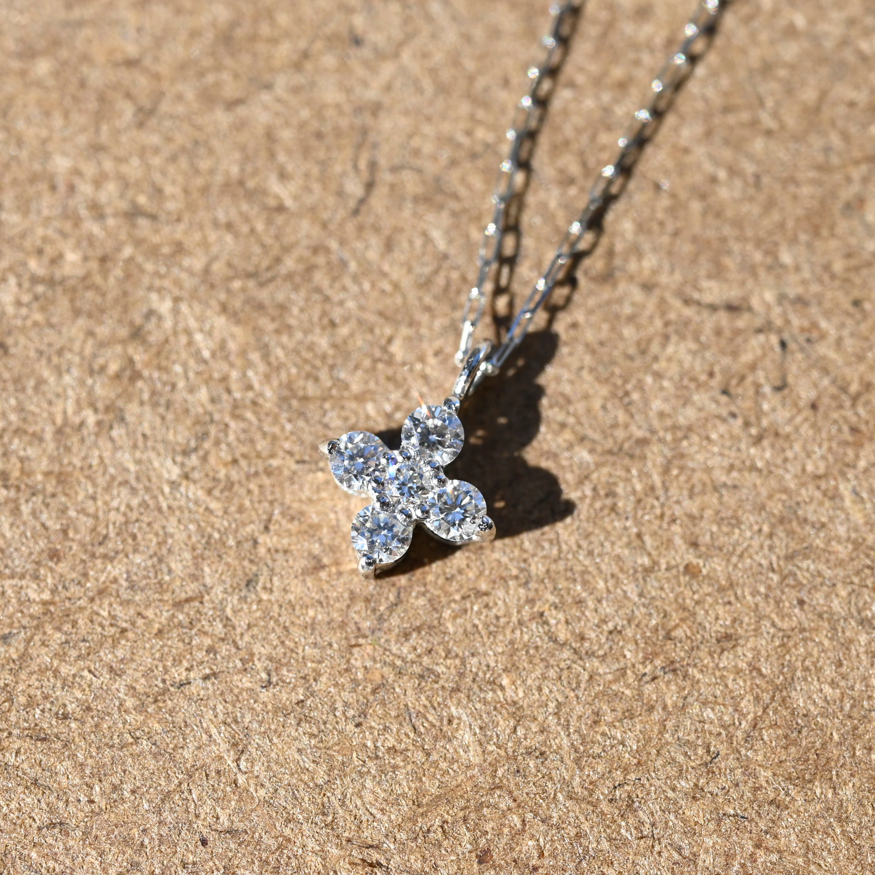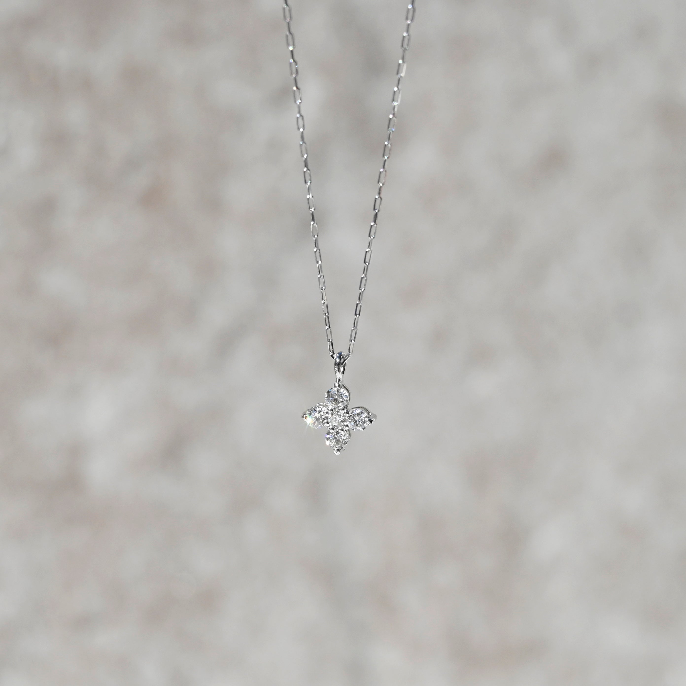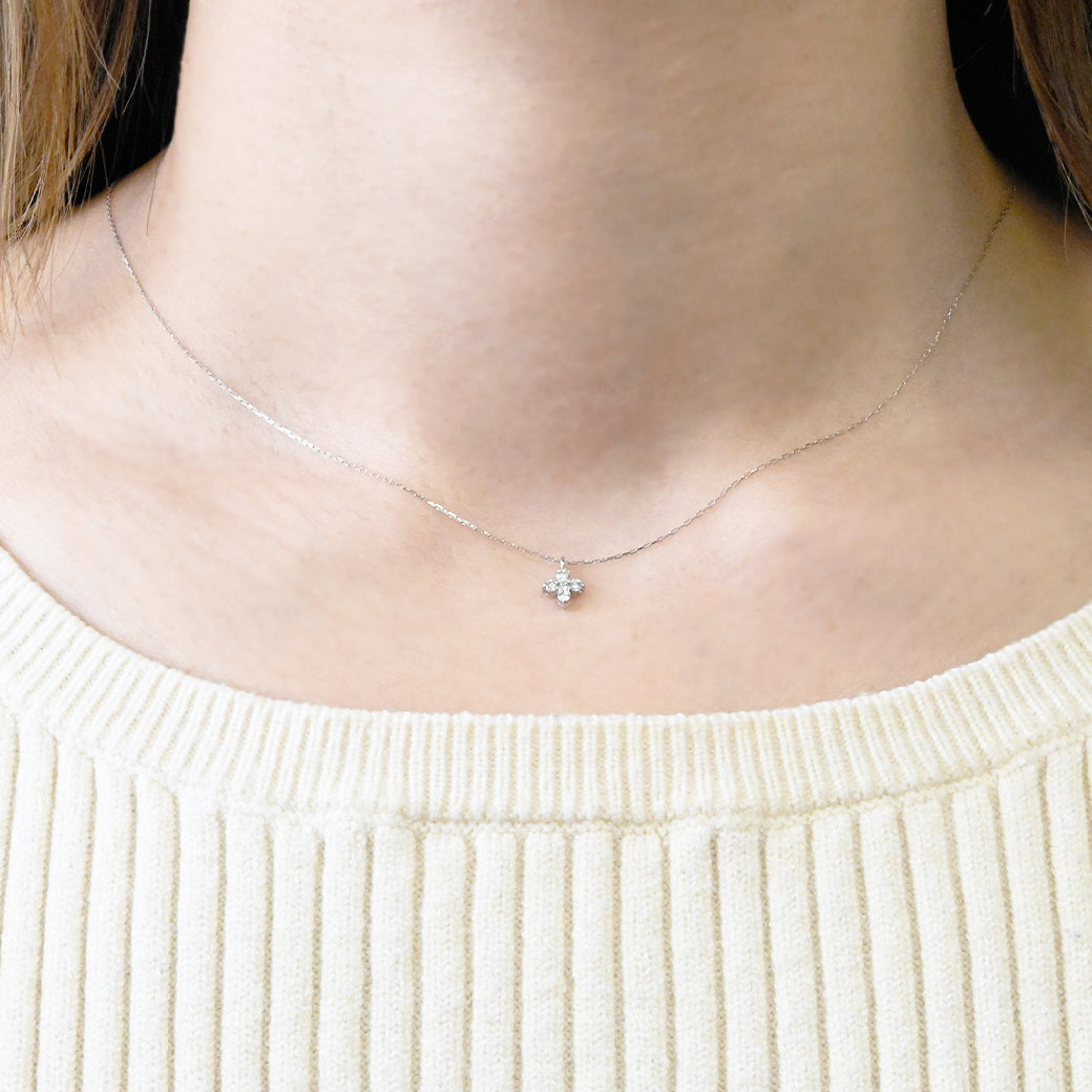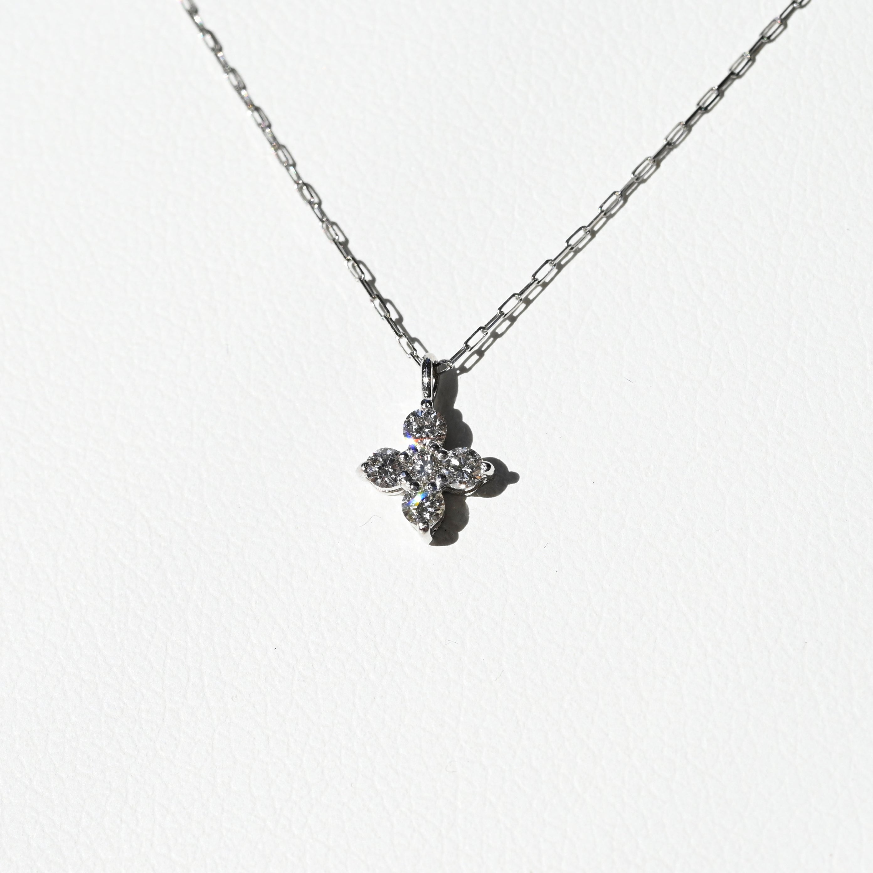 プラチナの凛とした輝きと、繊細な天然ダイヤモンドを組み合わせたフラワーモチーフのペンダント。5石のダイヤモンドを美しく配置し、上品で立体感のある花のシルエットを表現しています。