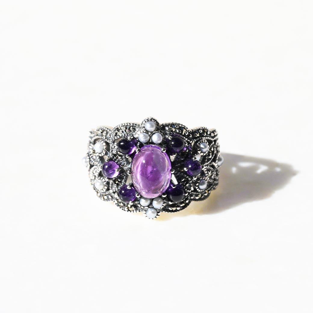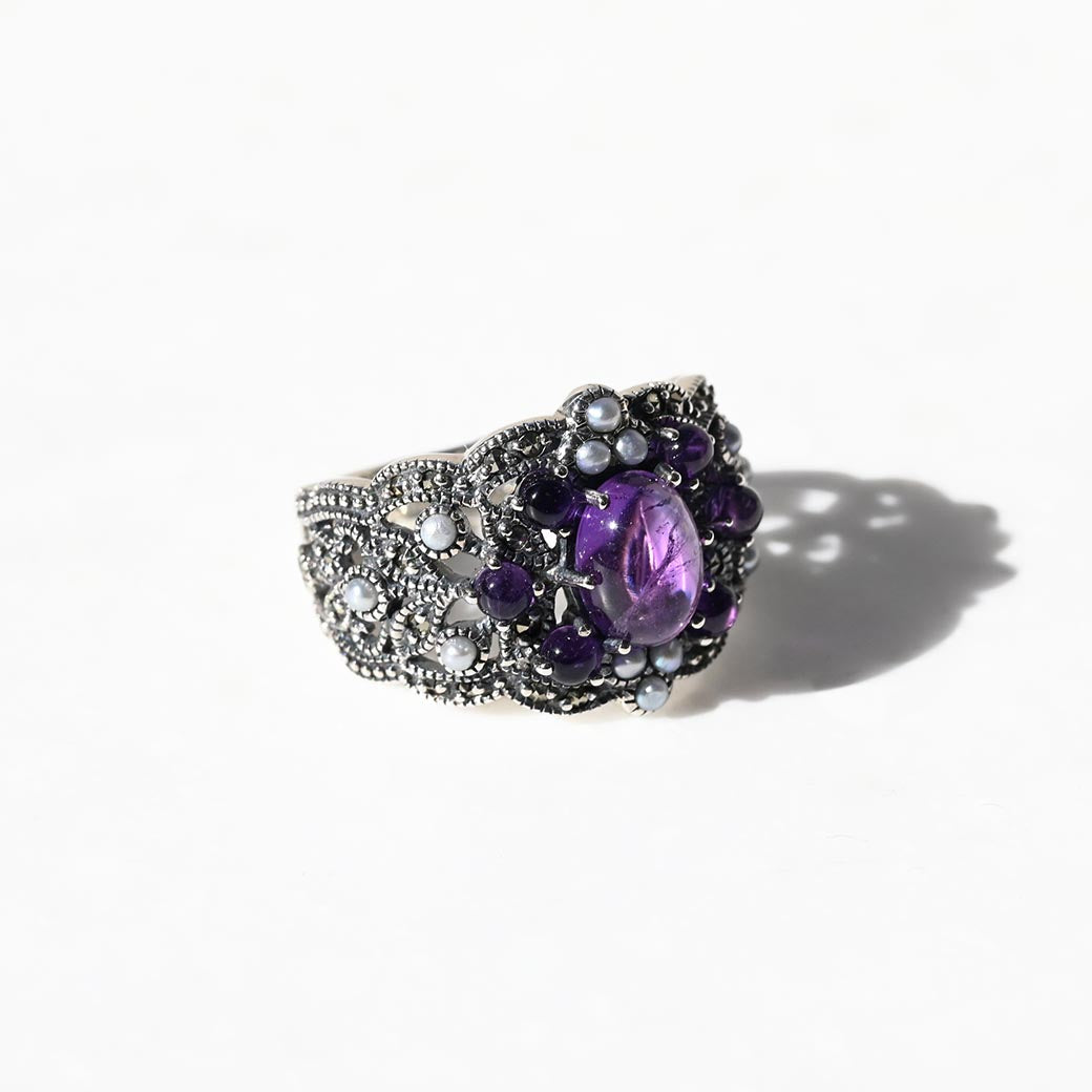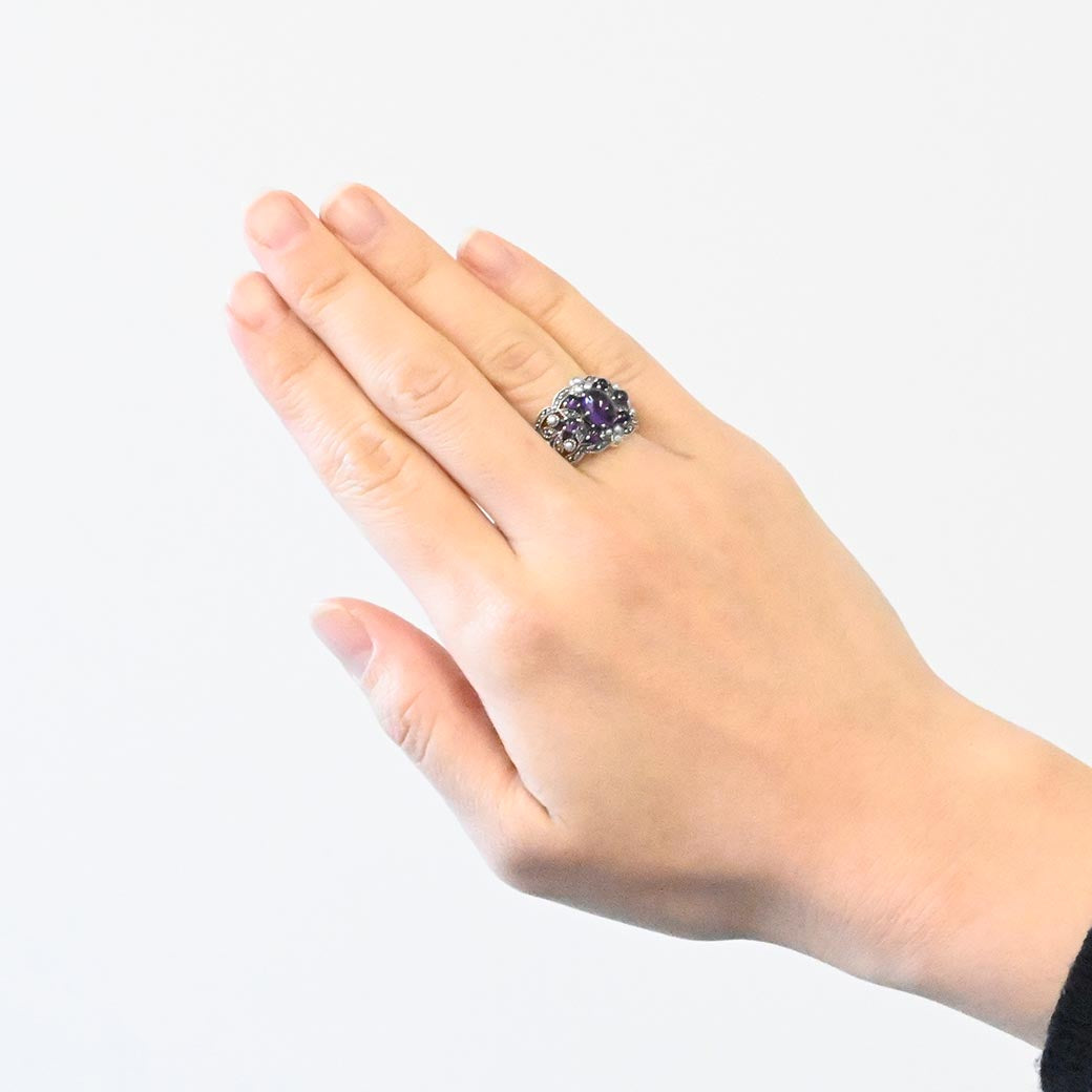 中央に配置された透明感のあるパープルのアメジストを囲むのは、小さなグレーパールとマーカサイトの装飾。それらがまるでブーケのように調和し、指先にミステリアスで気品ある印象を与えてくれます。