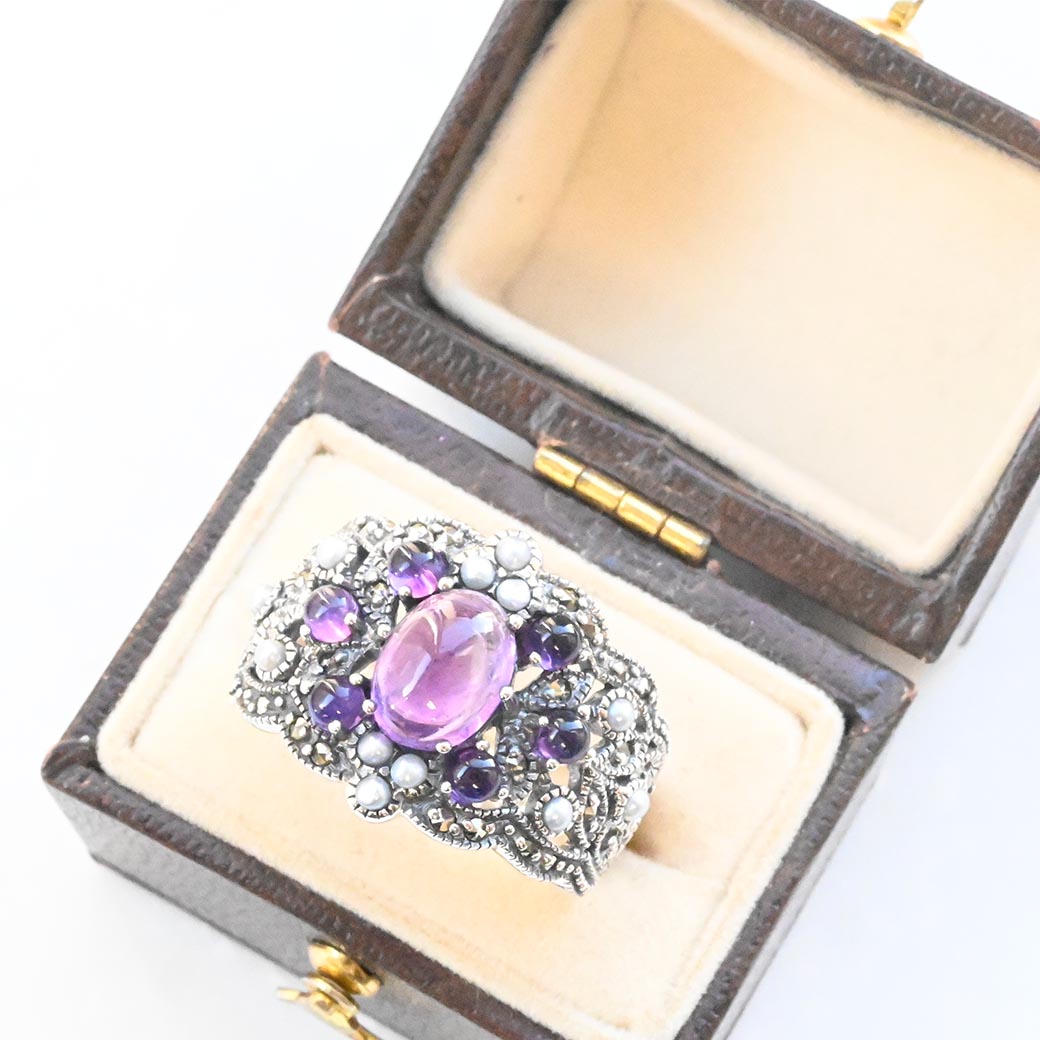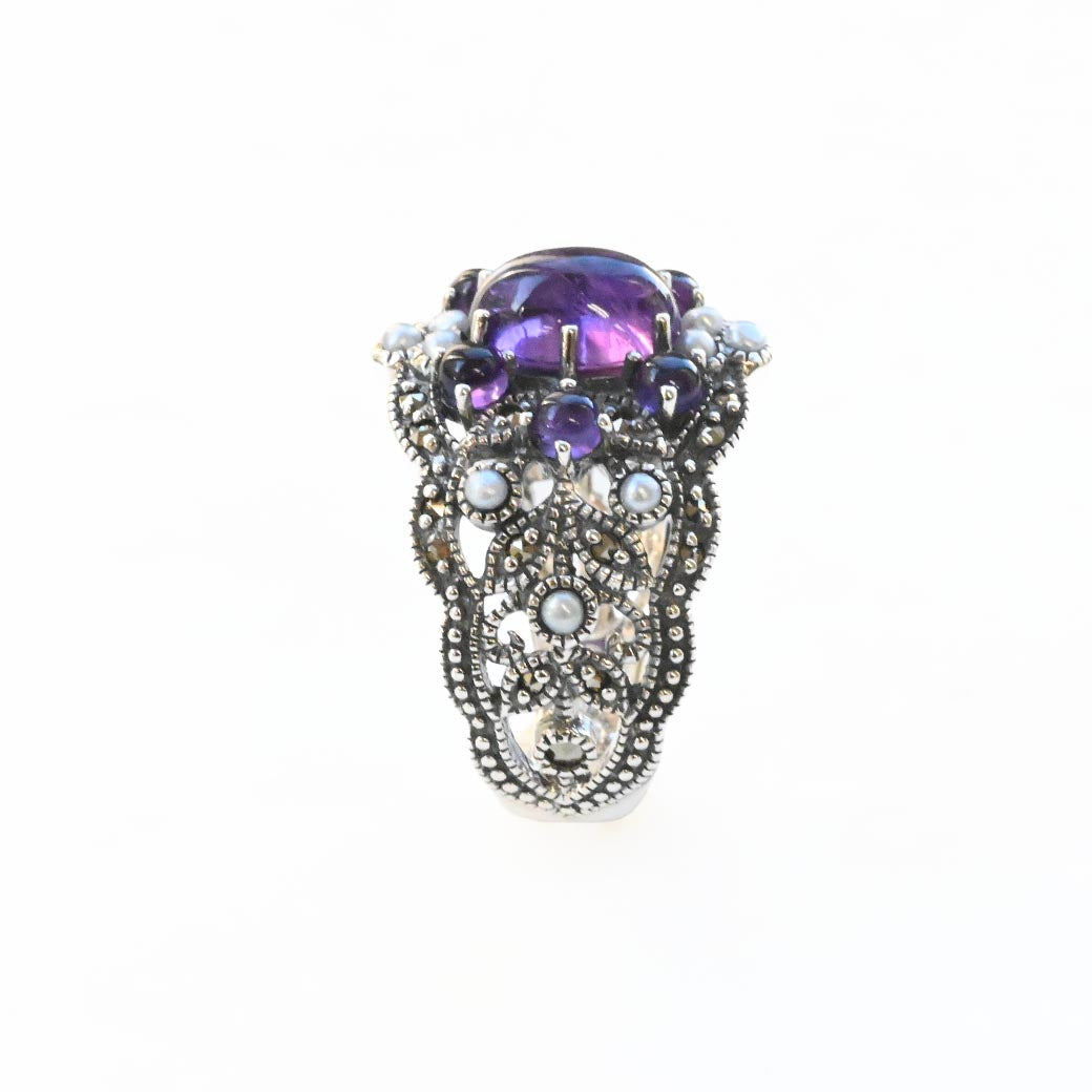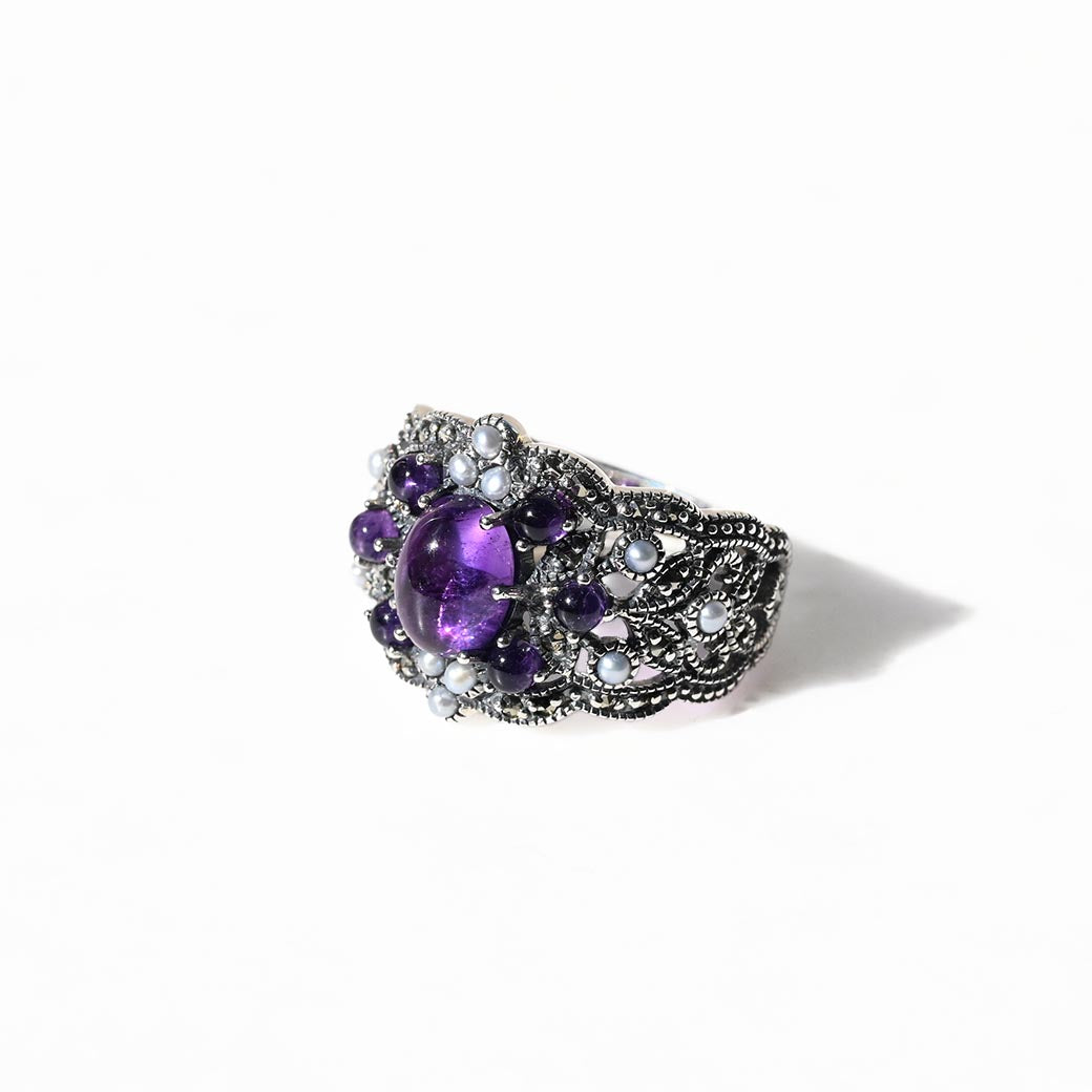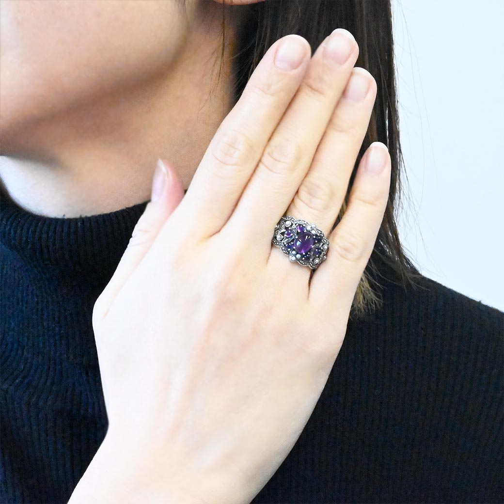 中央に配置された透明感のあるパープルのアメジストを囲むのは、小さなグレーパールとマーカサイトの装飾。それらがまるでブーケのように調和し、指先にミステリアスで気品ある印象を与えてくれます。
