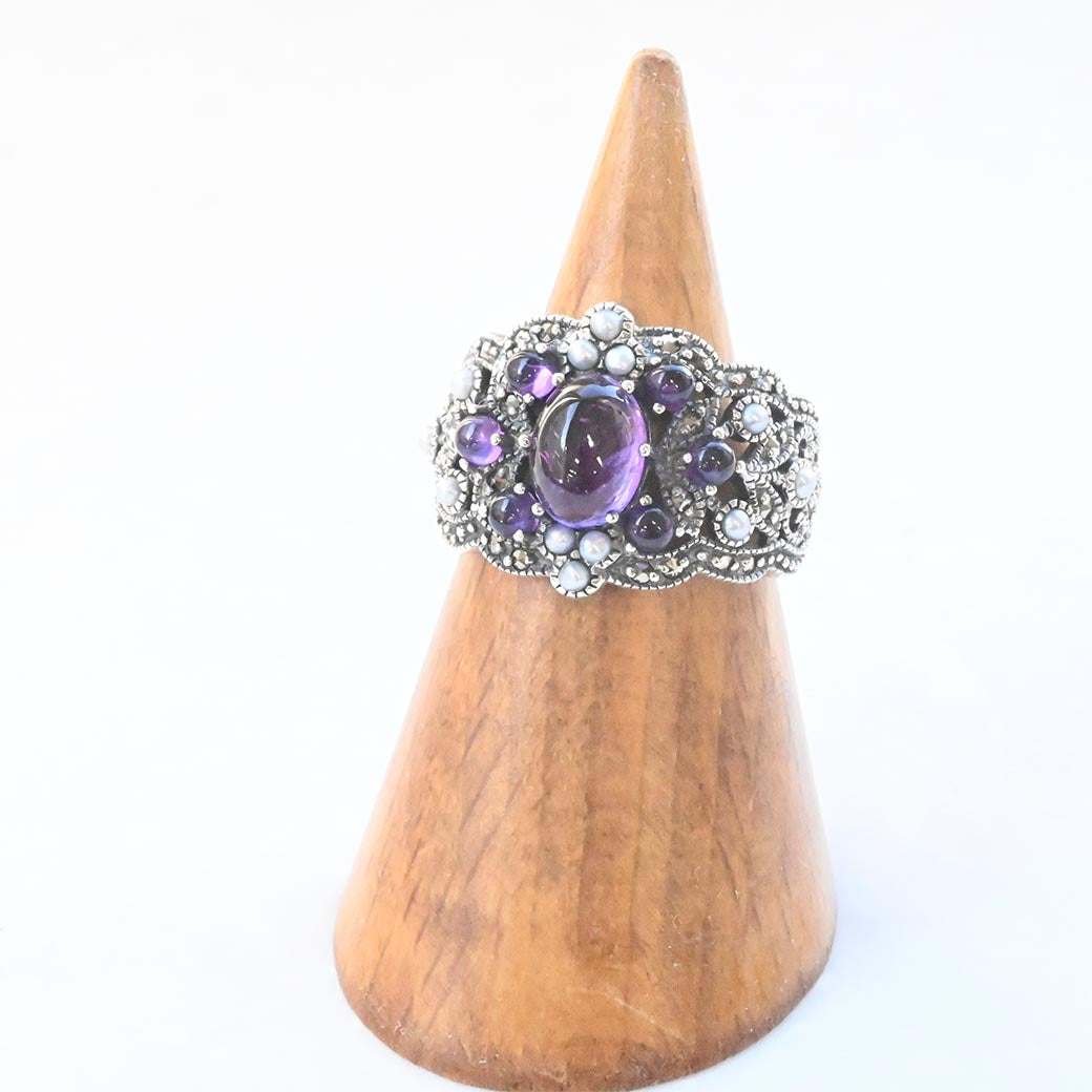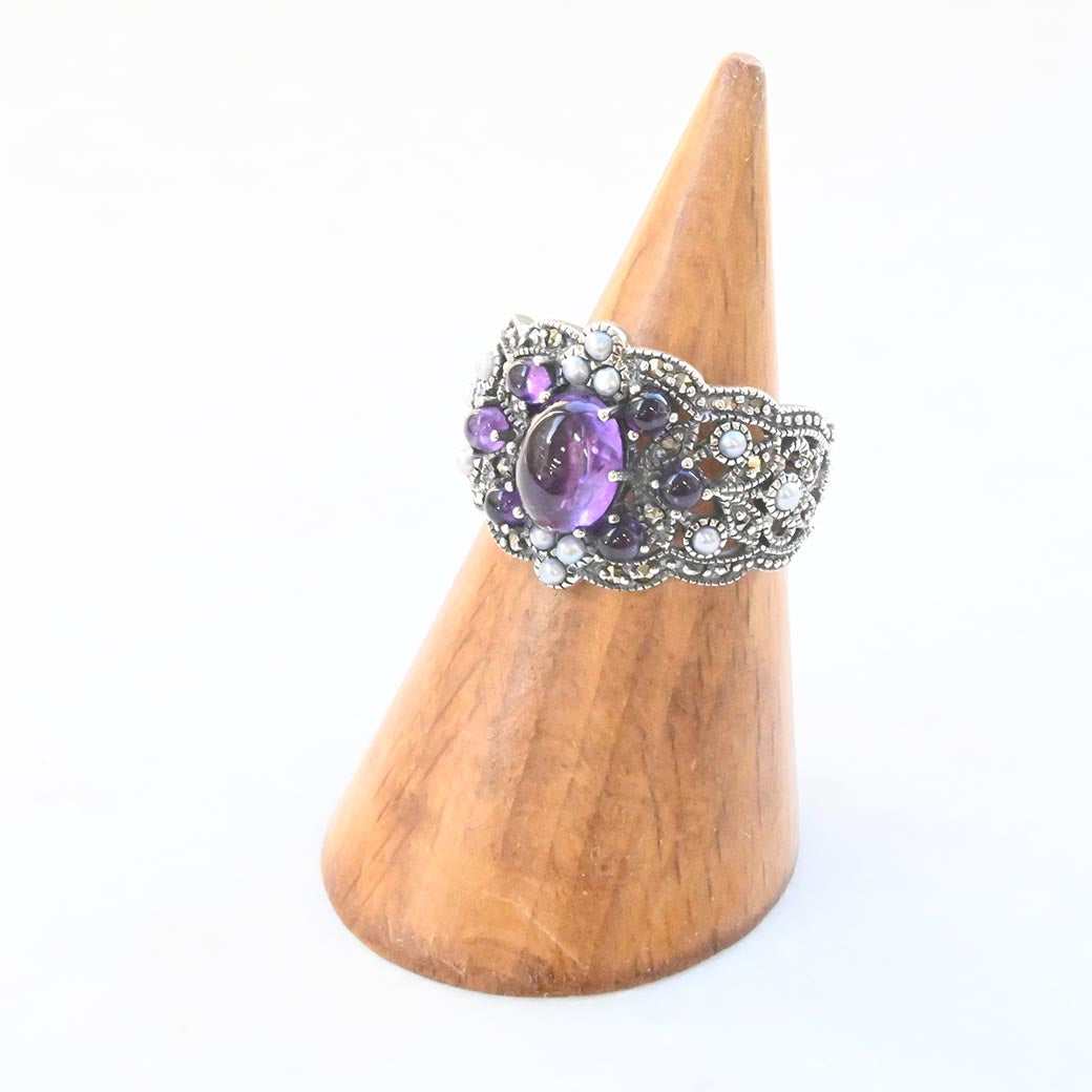 〈素材〉シルバー925〈石〉アメジスト、シードパール、マルカジット〈モチーフサイズ〉最大幅約22㎜(#11にて計測)〈サイズ直し〉±1