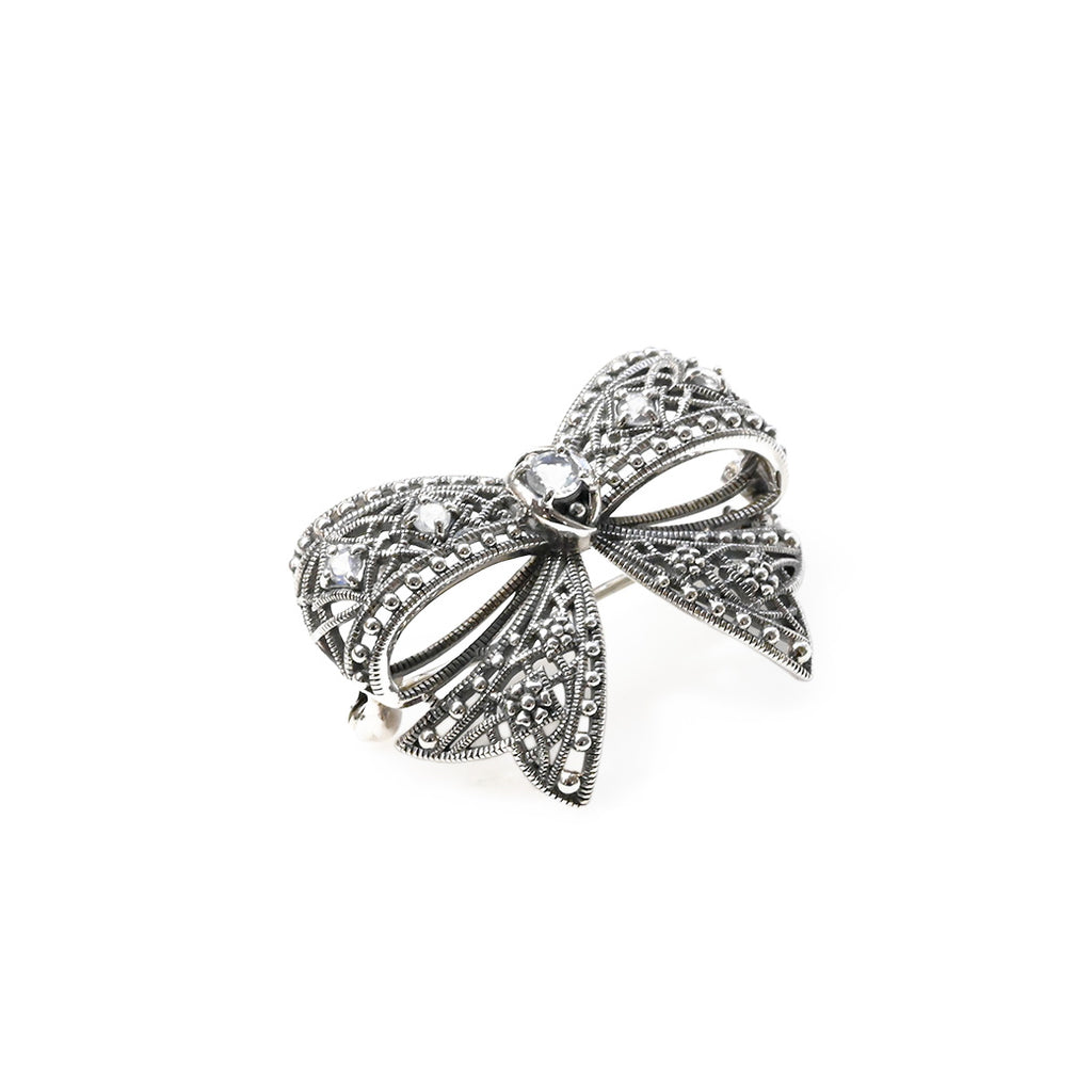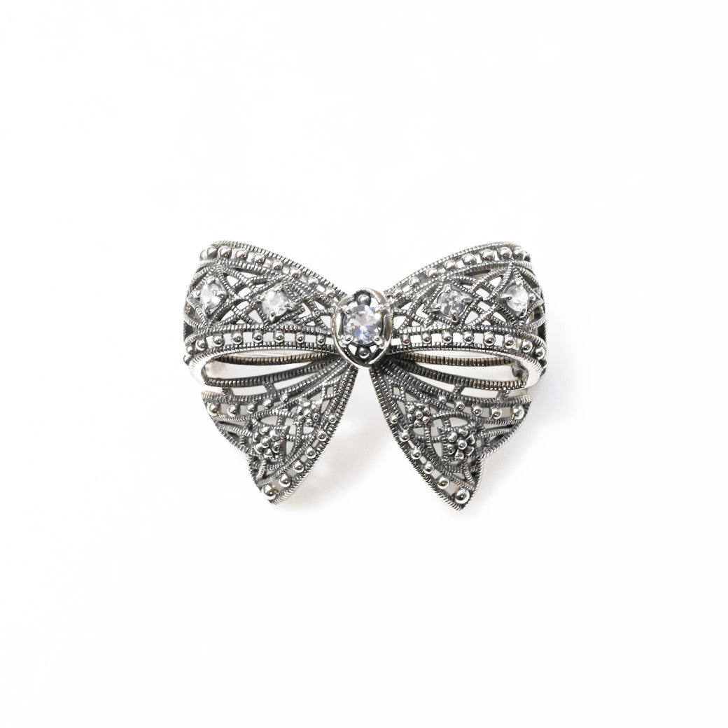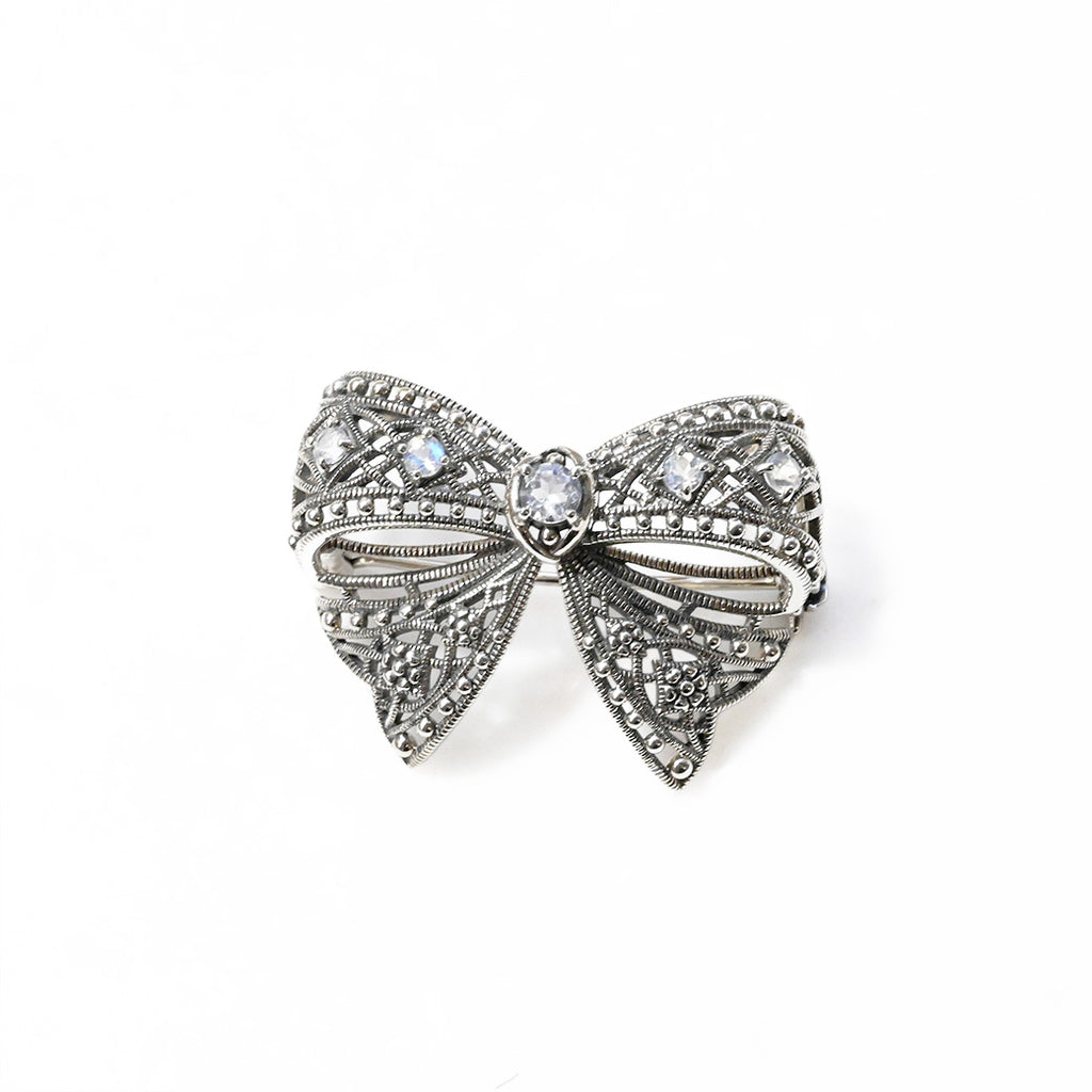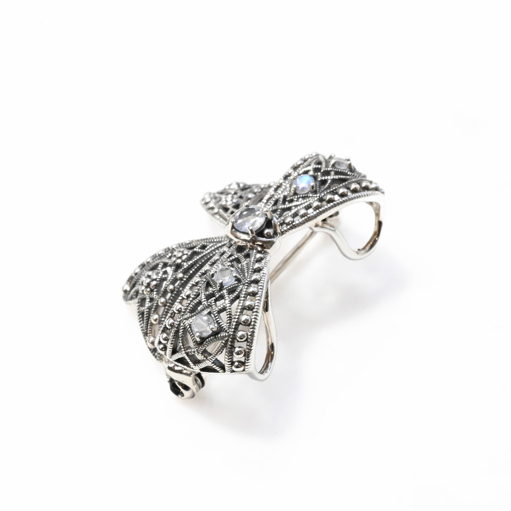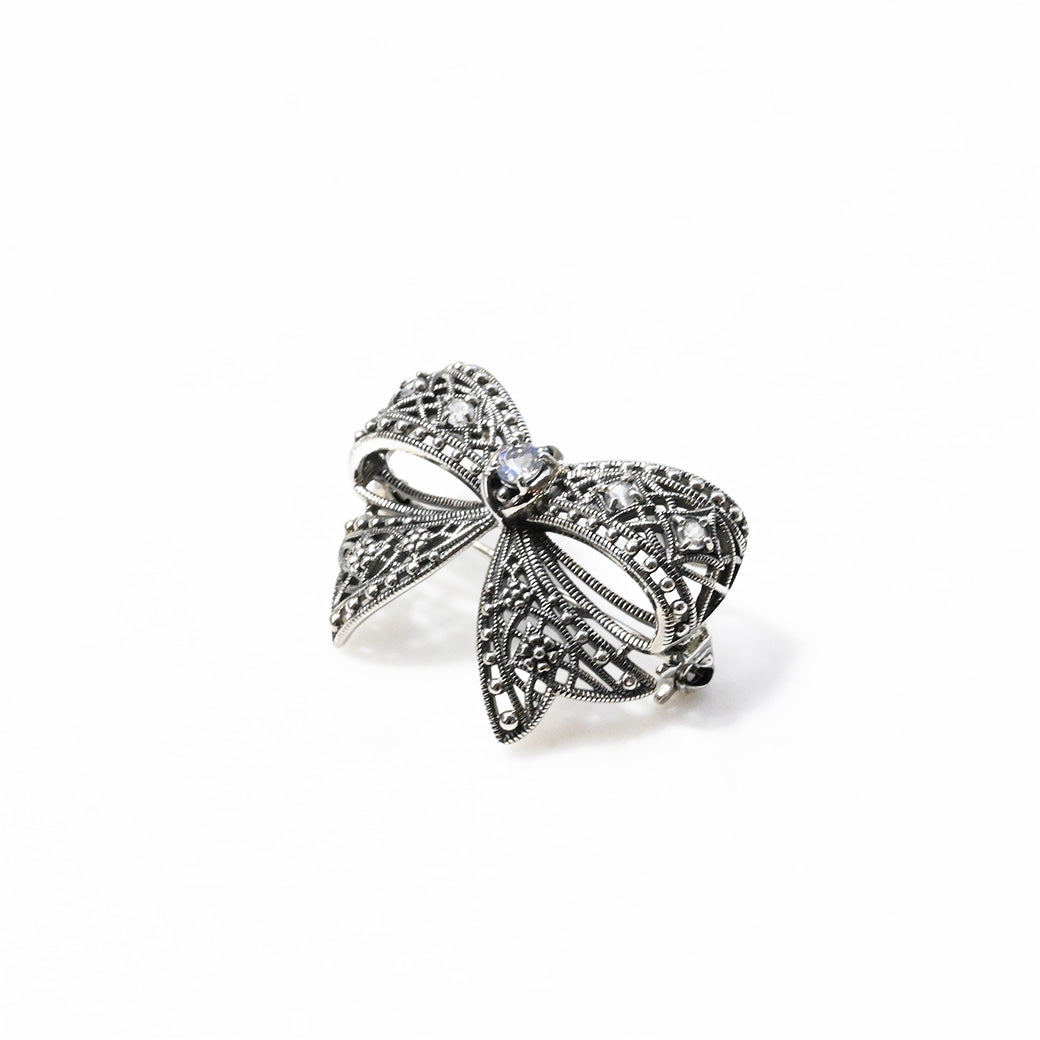 繊細なレースを思わせるシルバー細工で、可愛らしいリボンのかたちを丁寧に表現したブローチです。左右対称のデザインは上品さとモダンさをあわせ持ち、どんな装いにもやさしく寄り添います。