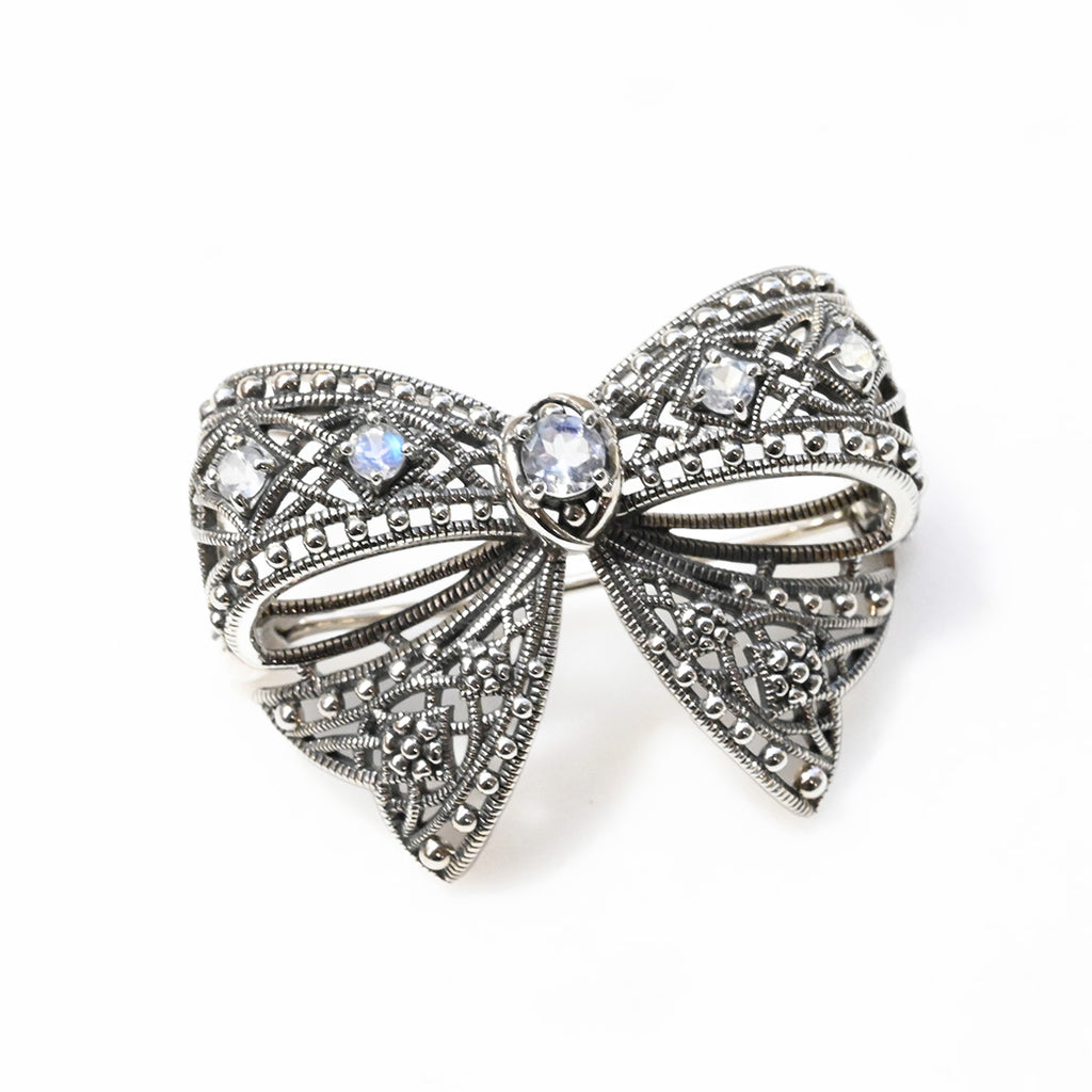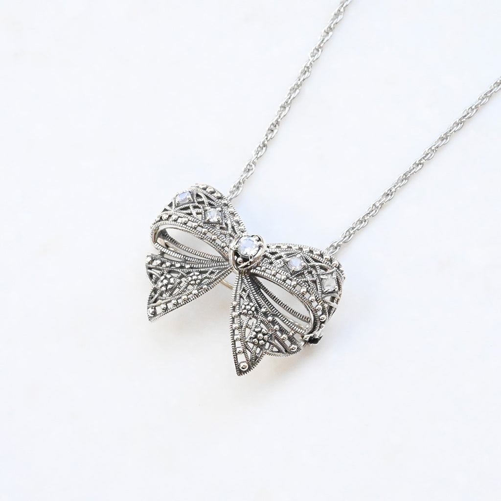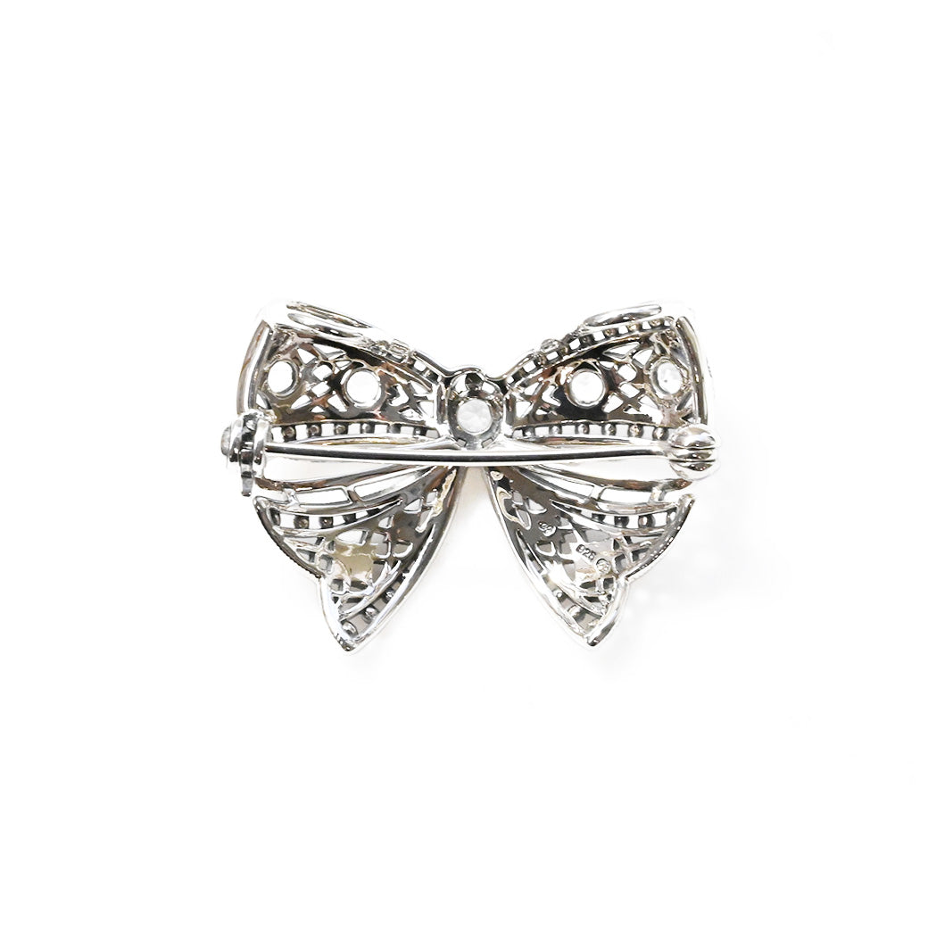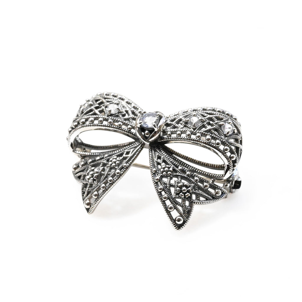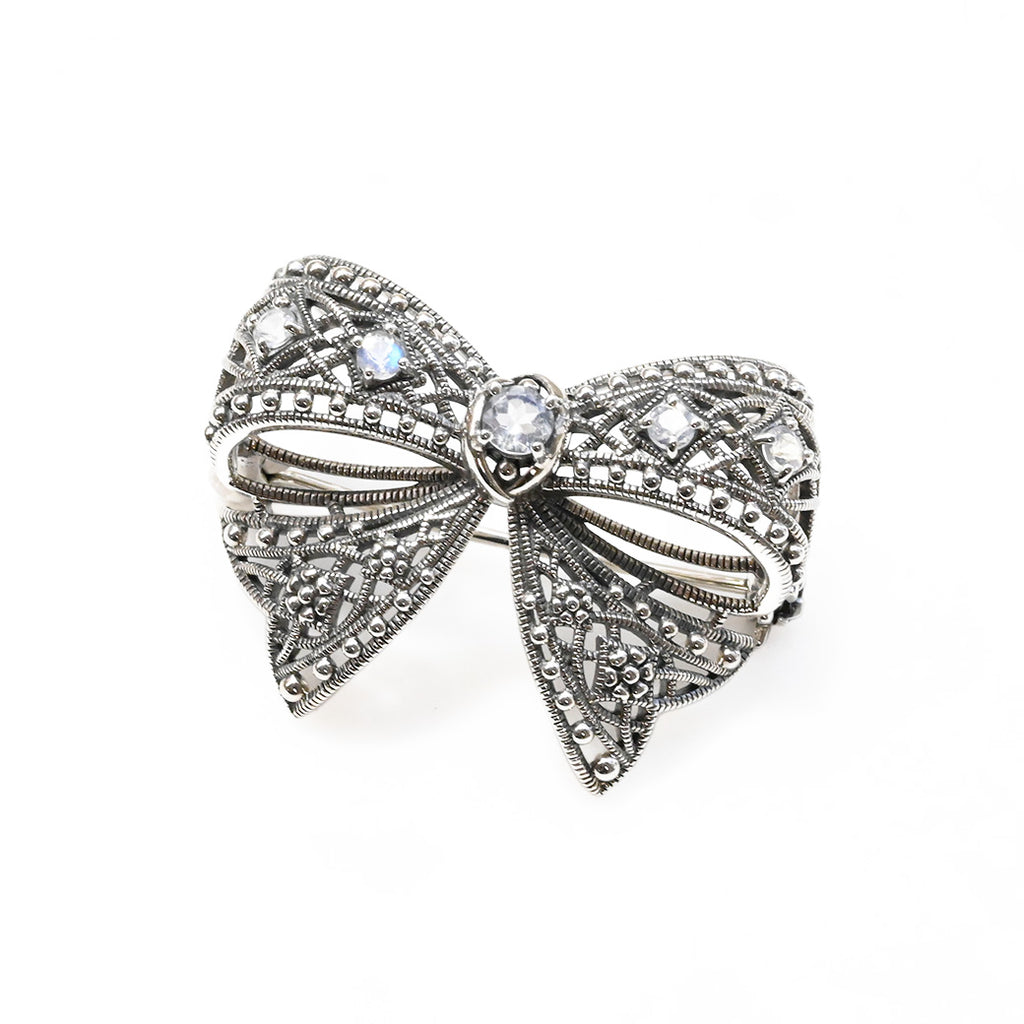 繊細なレースを思わせるシルバー細工で、可愛らしいリボンのかたちを丁寧に表現したブローチです。左右対称のデザインは上品さとモダンさをあわせ持ち、どんな装いにもやさしく寄り添います。