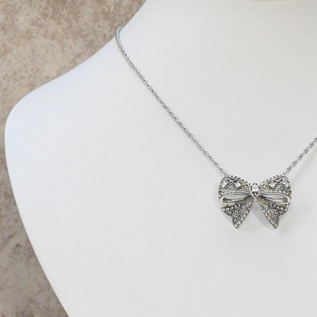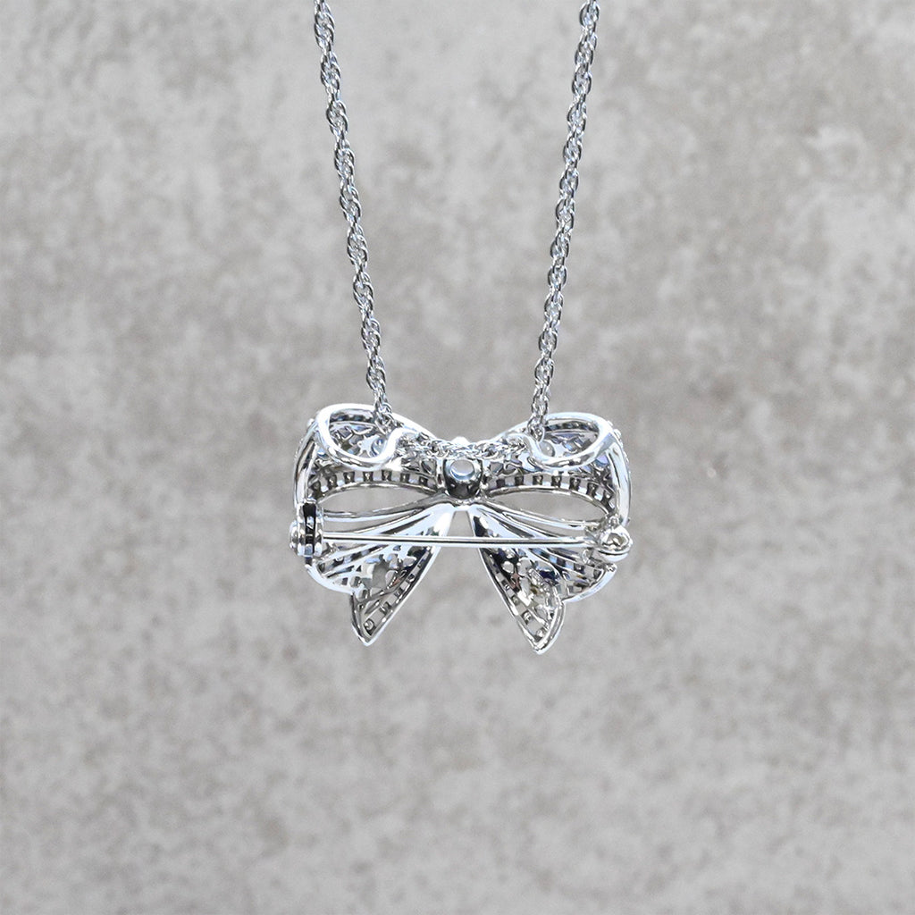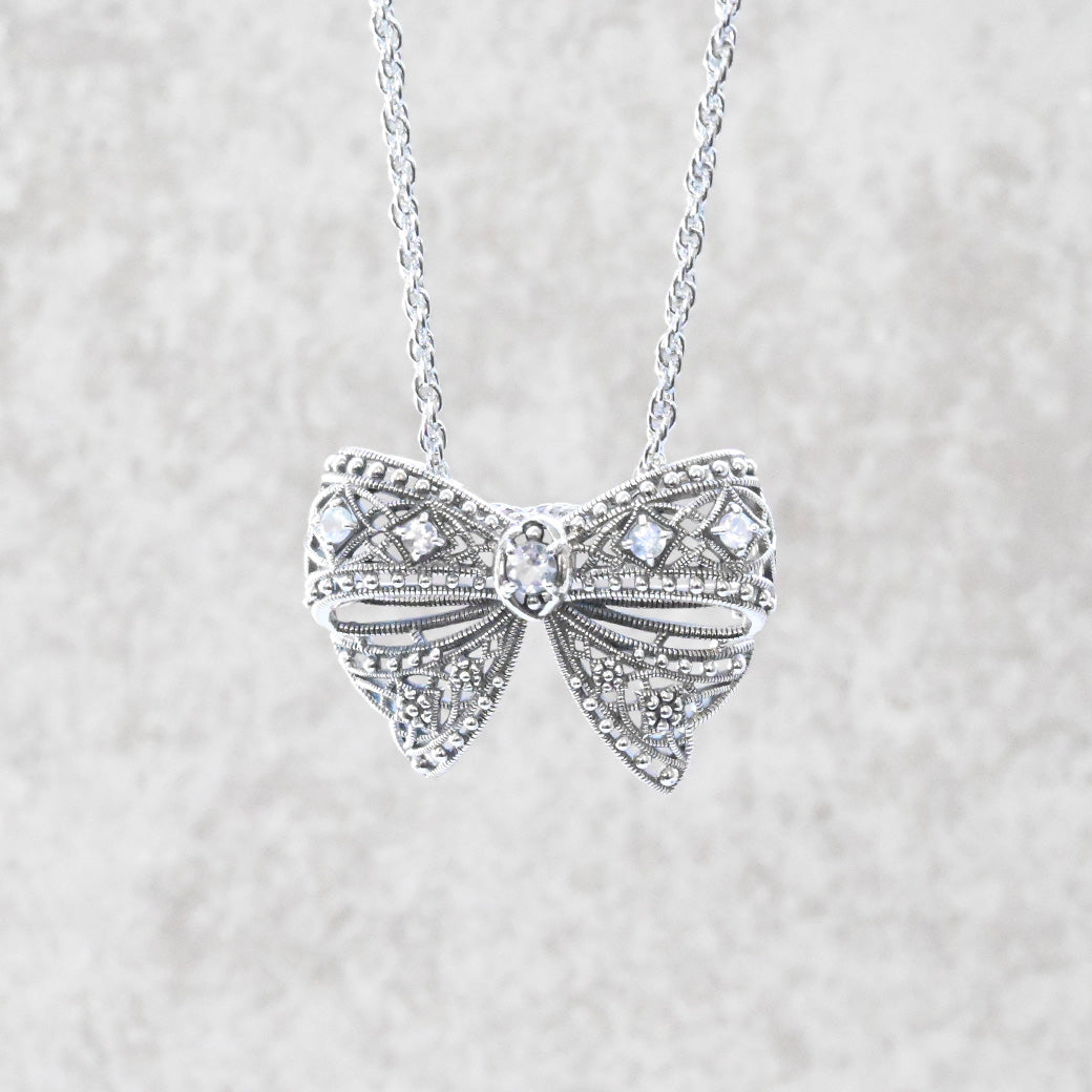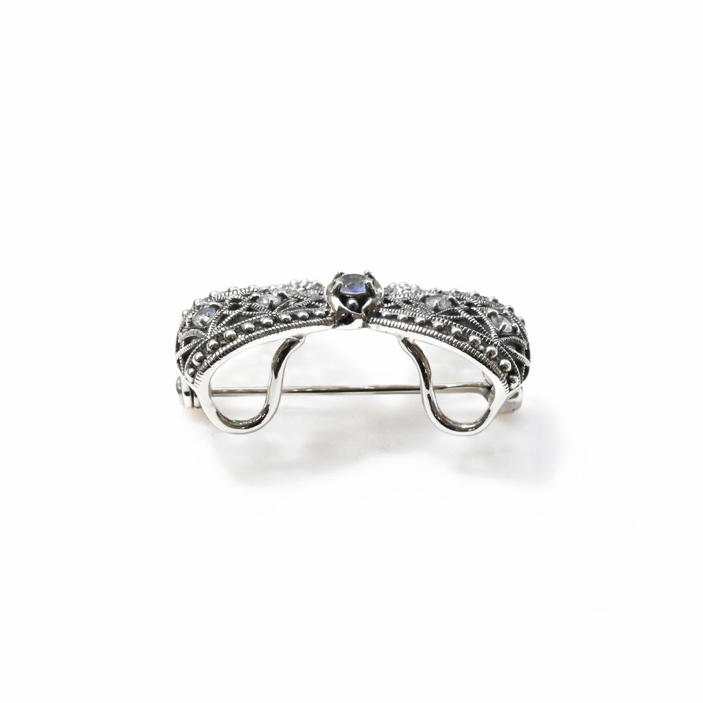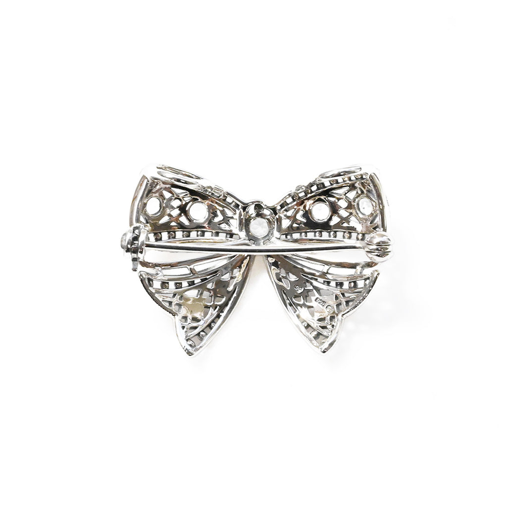 繊細なレースを思わせるシルバー細工で、可愛らしいリボンのかたちを丁寧に表現したブローチです。左右対称のデザインは上品さとモダンさをあわせ持ち、どんな装いにもやさしく寄り添います。
