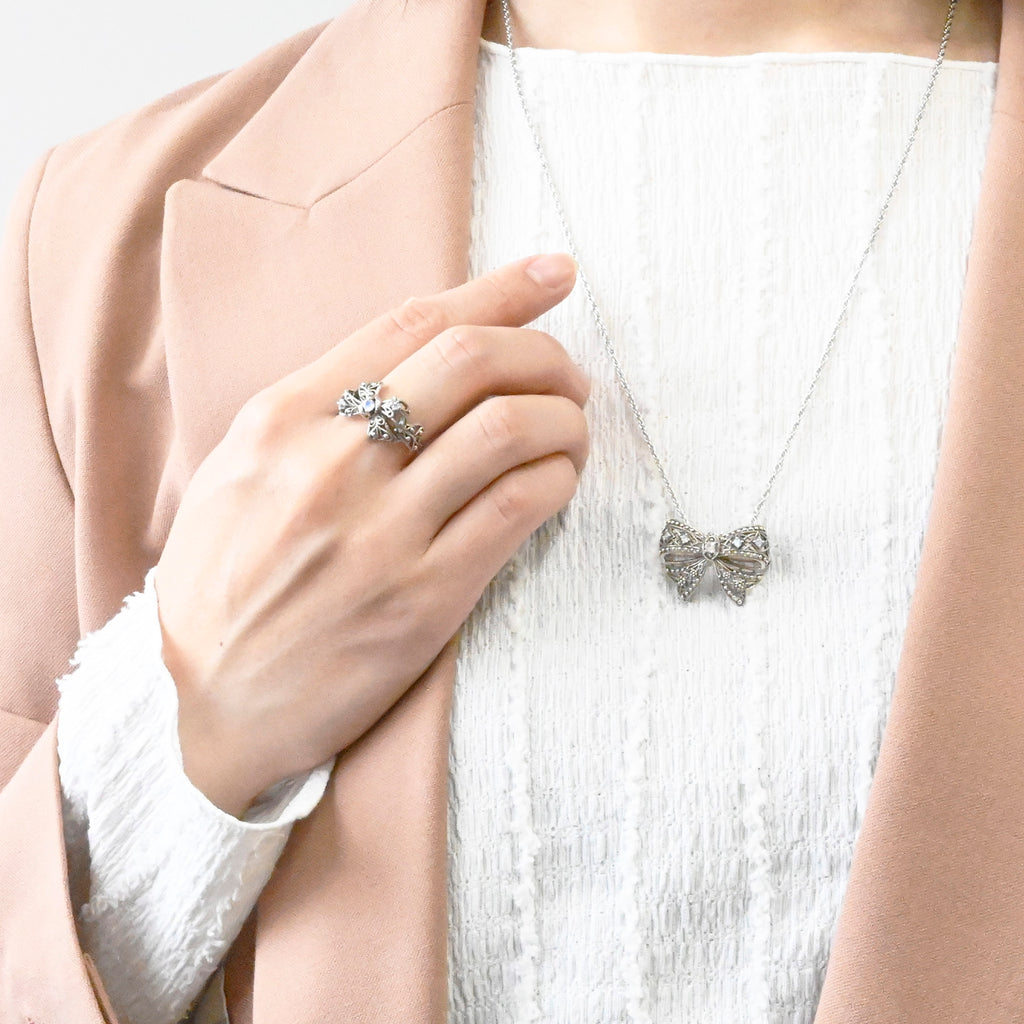 中央とリボンの上部には、清らかな輝きを放つホワイトトパーズをあしらいました。透明感のあるそのきらめきは、光を受けてさりげなく煌めき、品のある大人の女性らしさを演出してくれます。