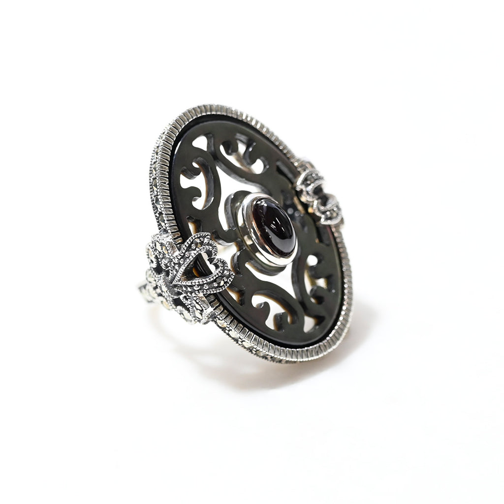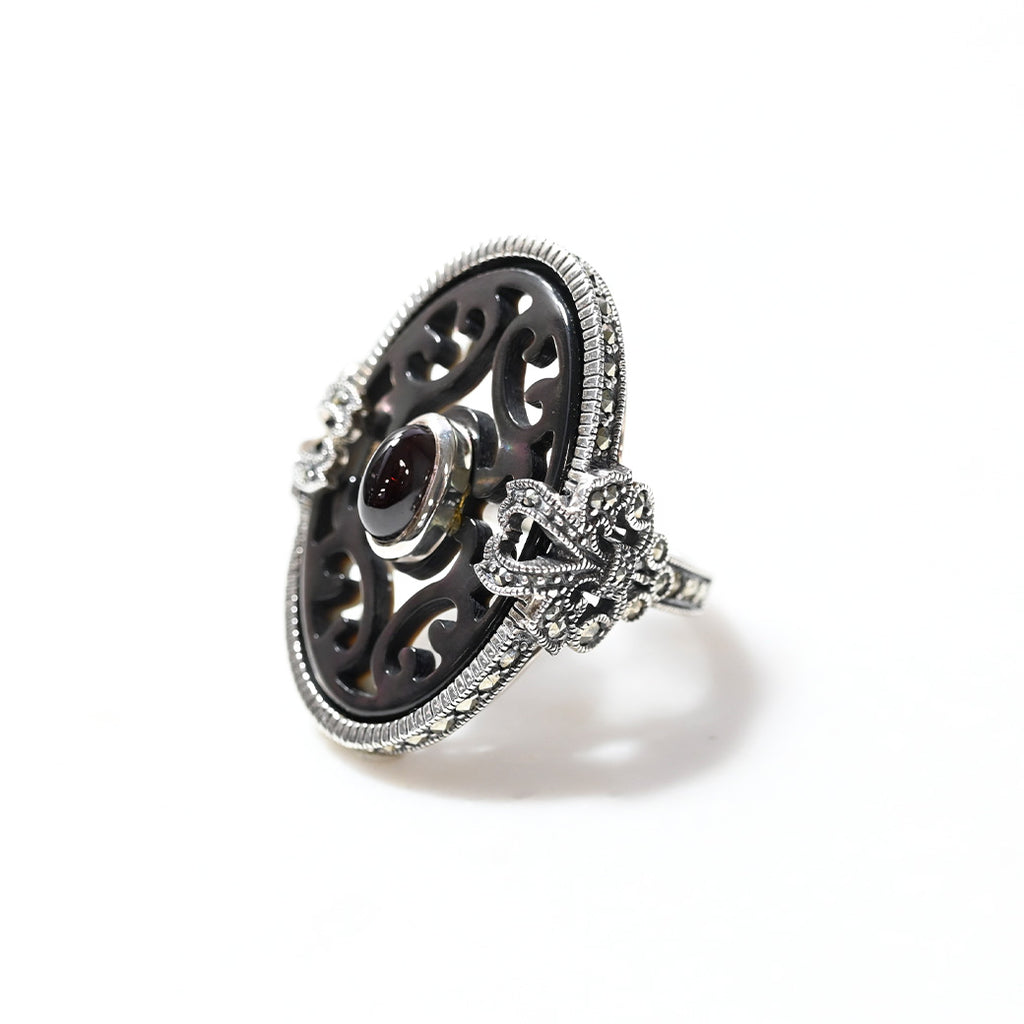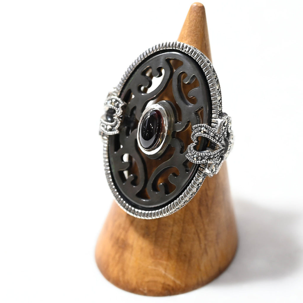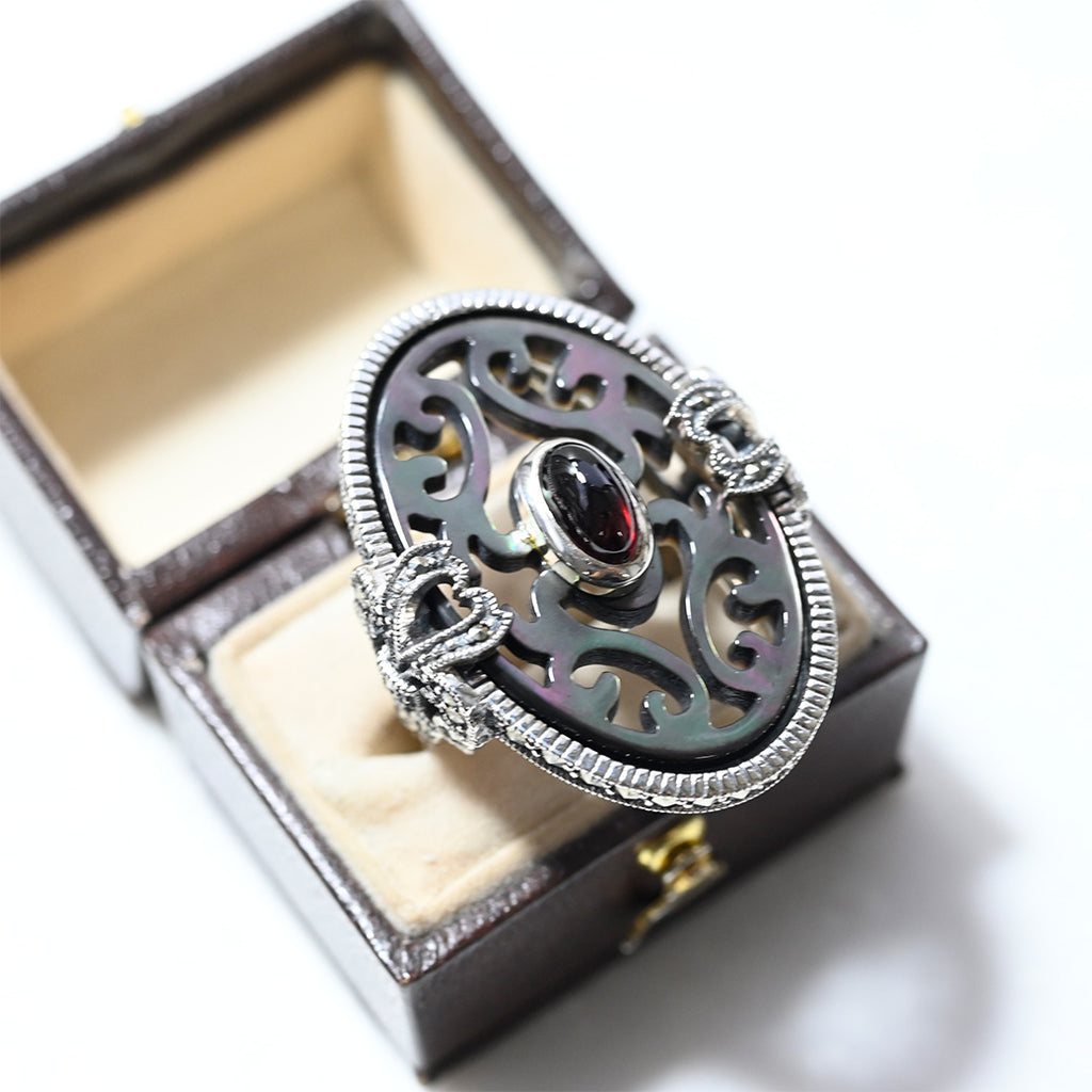 ■DETAIL〈素材〉シルバー925〈石〉黒蝶貝、ガーネット、マルカジット〈モチーフサイズ〉最大縦約34mm×横約25mm※ブローチペンダント、ペンダントと表記がございますものは、真鍮サービスチェーンをお付けします。(リング、イヤリング、ピアス、K18、K10商品には付属しません。)■ご購入前にご確認ください※天然石を使用している為、色や形に多少の個体差があること、また、ブラウザによって実際の色味に若干差が出ますことをご了承ください。※撮影小物は付属いたしません。※商品の仕様変更、石変更は承っておりません。※ご注文後のお客様都合による返品・交換(サイズやイメージ違いなど)は承っておりません。不良品のみ返品を承ります。詳しくはこちら※着け心地や重さ等、その他ご不明な点はチャットにてお問い合わせくださいませ。