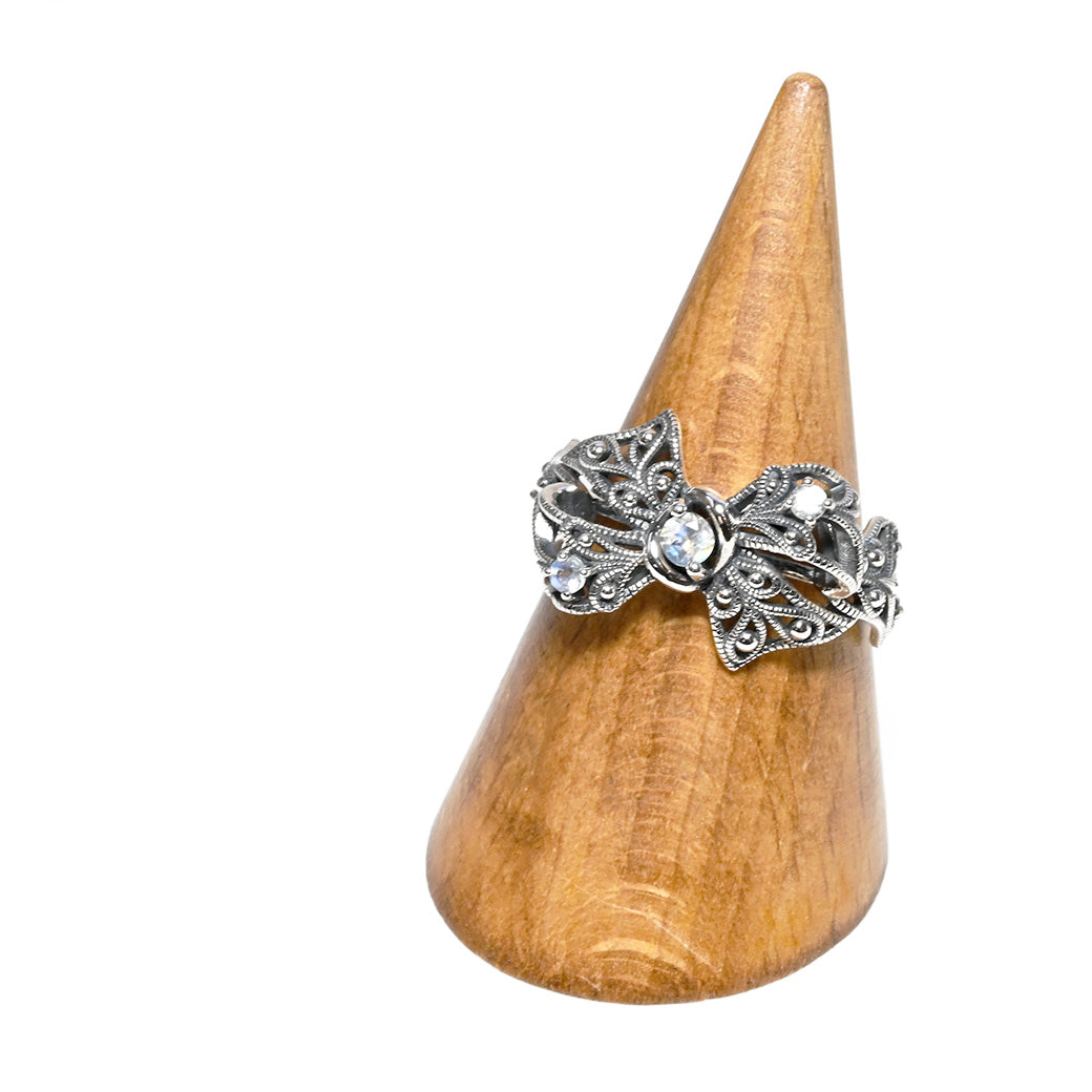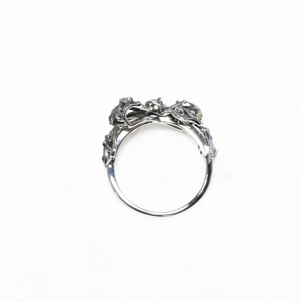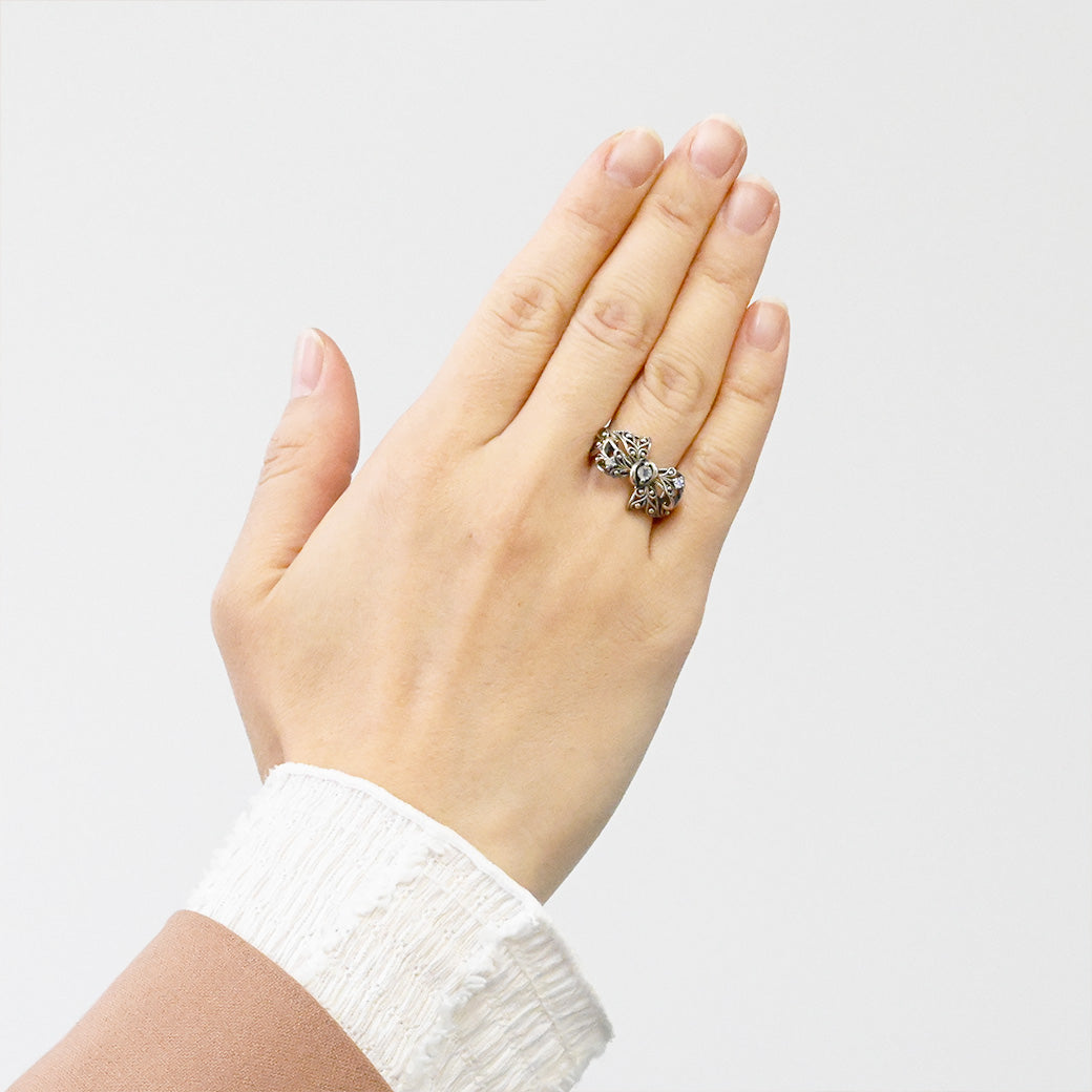 お花や植物のモチーフをあしらった、可憐なリボンデザインのリング。動きのあるやわらかなフォルムが指先に自然な華やかさを添え、上品さと愛らしさをあわせ持ったデザインです。フォーマルな場面にも映える存在感があります。