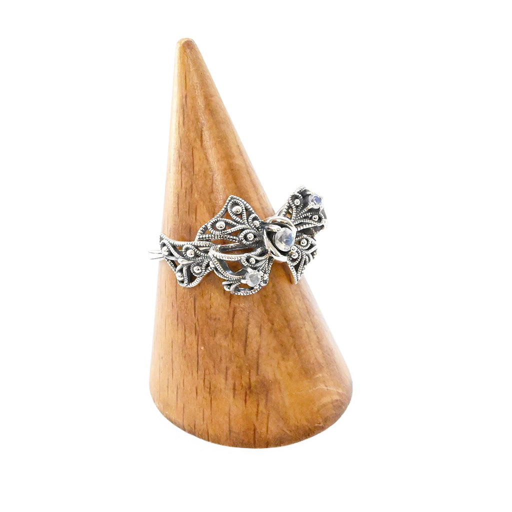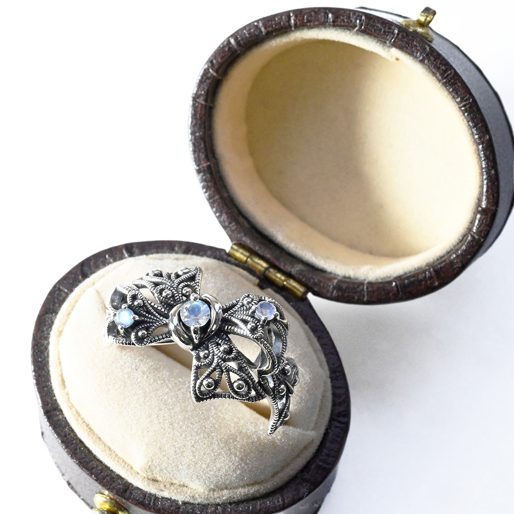 〈素材〉シルバー925〈石〉レインボームーンストーン〈モチーフサイズ〉最大幅23㎜(13号平置き計測の場合)〈サイズ調整〉±1号※ブローチペンダント、ペンダントと表記がございますものは、真鍮サービスチェーンをお付けします。(リング、イヤリング、ピアス、K18、K10商品には付属しません。)■ご購入前にご確認ください※天然石を使用している為、色や形に多少の個体差があること、また、ブラウザによって実際の色味に若干差が出ますことをご了承ください。※撮影小物は付属いたしません。※商品の仕様変更、石変更は承っておりません。※ご注文後のお客様都合による返品・交換(サイズやイメージ違いなど)は承っておりません。不良品のみ返品を承ります。詳しくはこちら※着け心地や重さ等、その他ご不明な点はチャットにてお問い合わせくださいませ。
