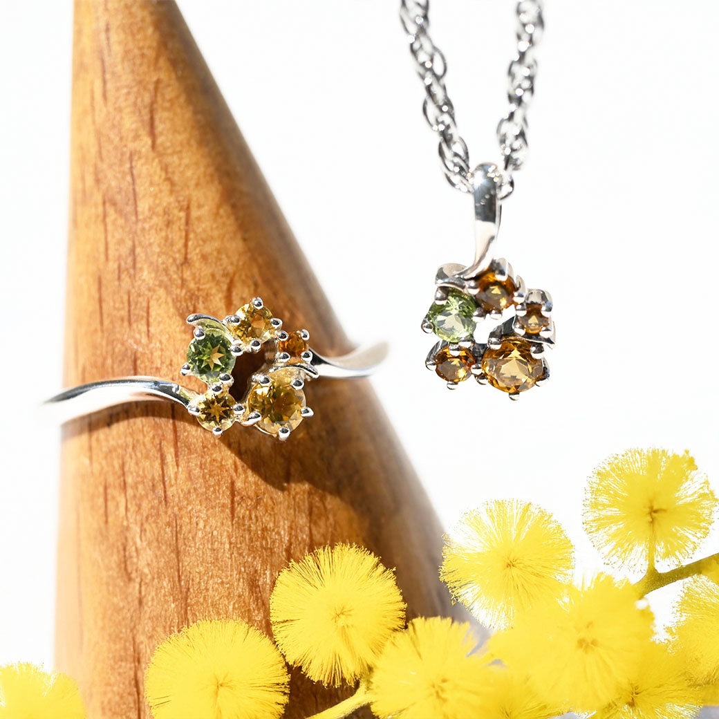 黄色いシトリンが花びらを、グリーンのペリドットが葉を表現し、天然石ならではの透明感が季節の喜びを運んでくれます。石の色で花を表現したシンプルなデザインは、日常使いからお出かけまで幅広くお使いいただけます。