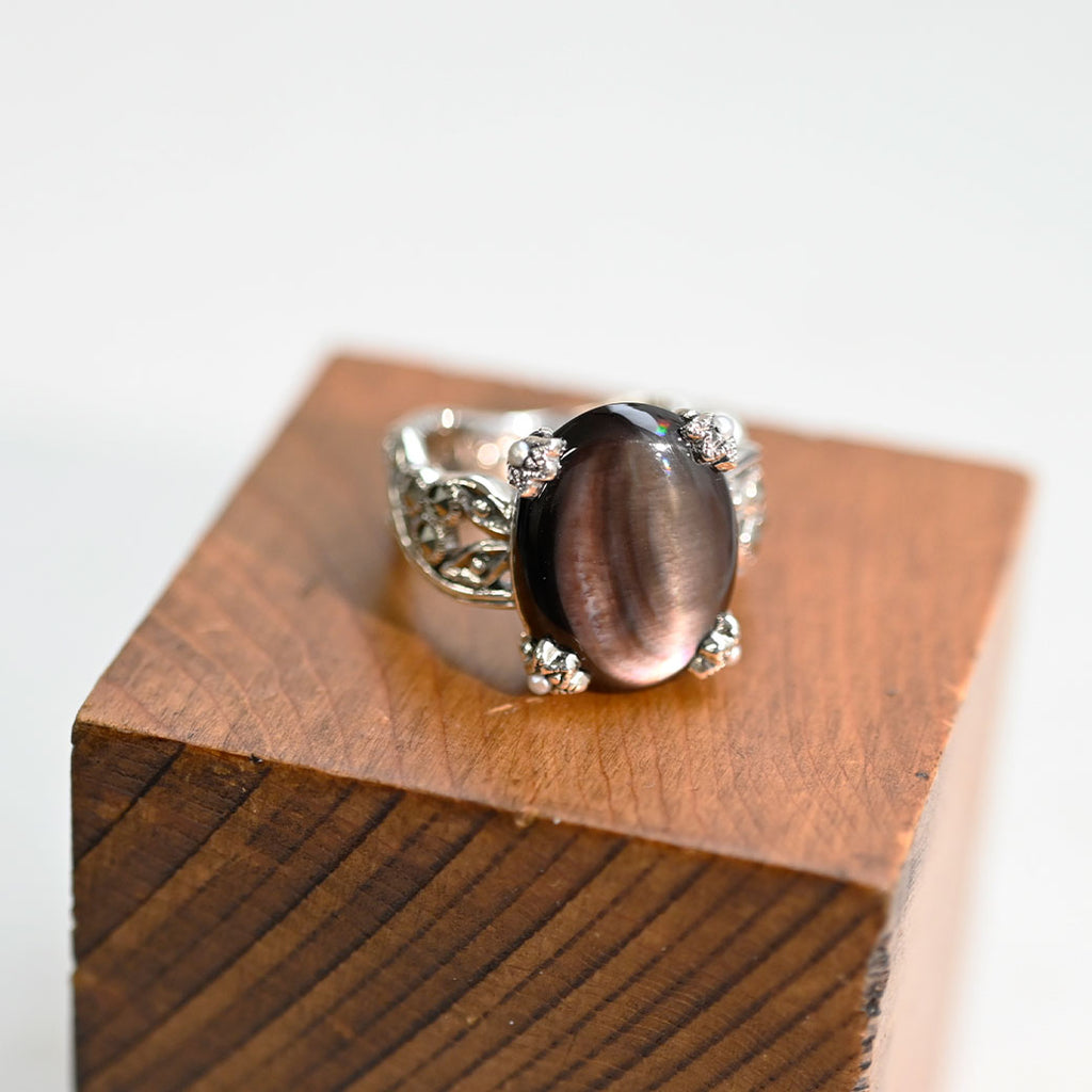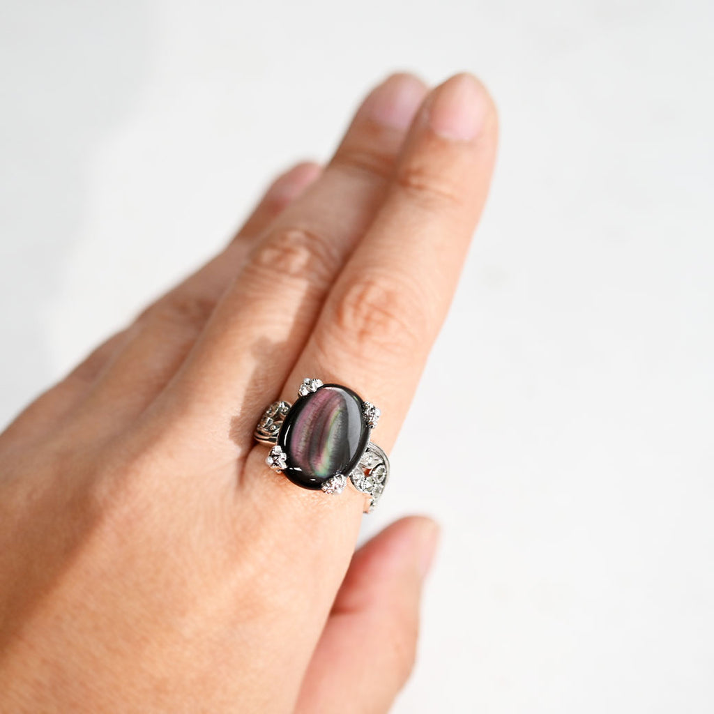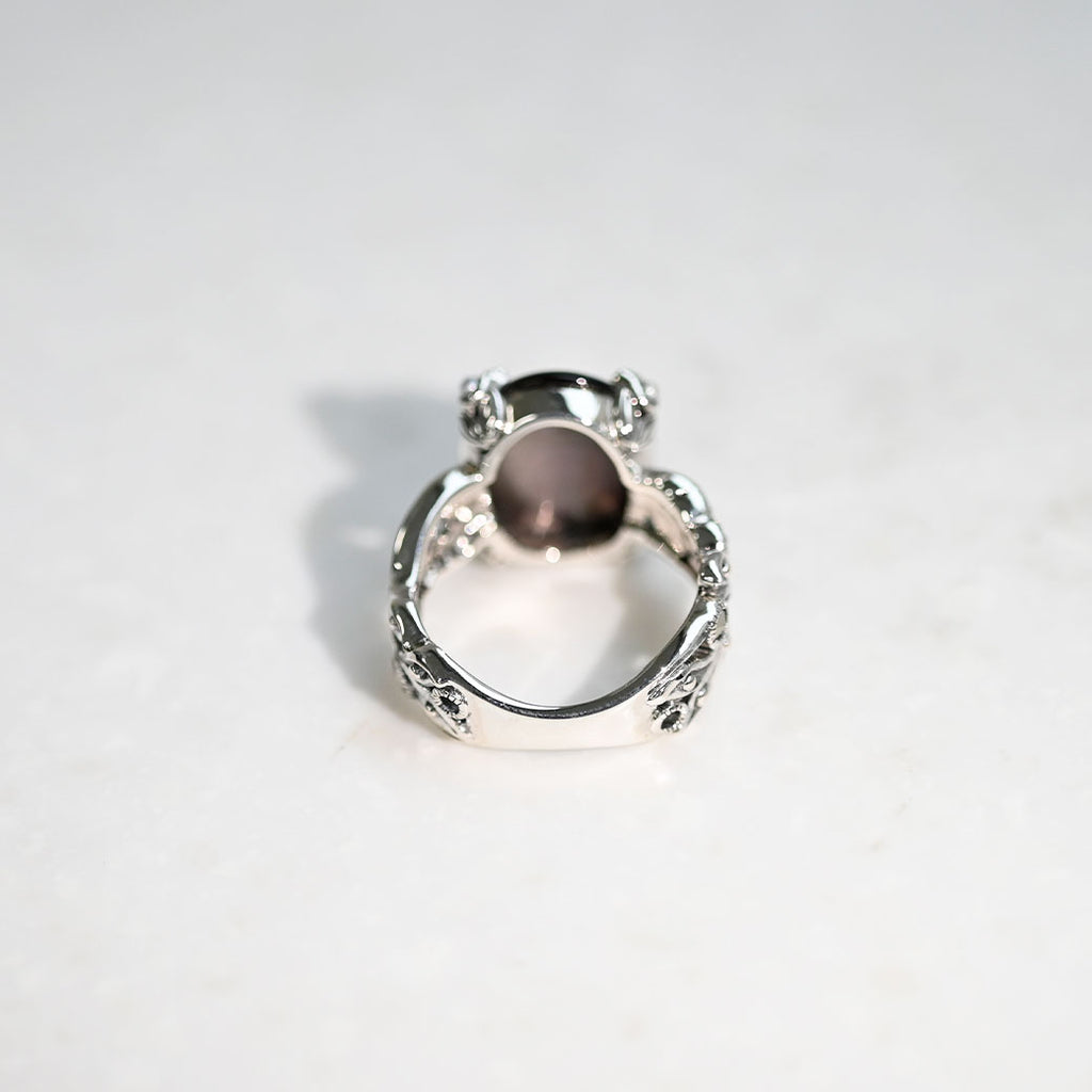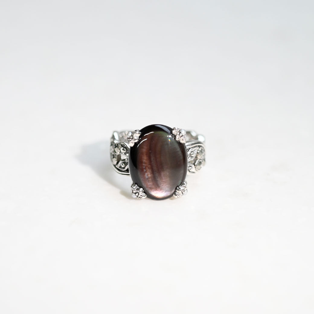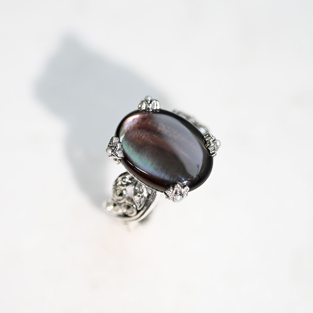 オーバルカボションのつややかな黒蝶貝に花飾りを乗せて飾った可愛らしいリングです