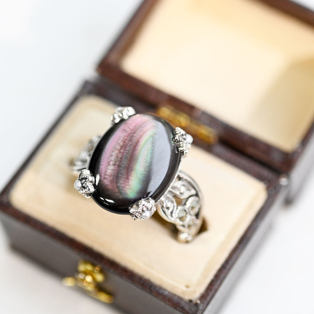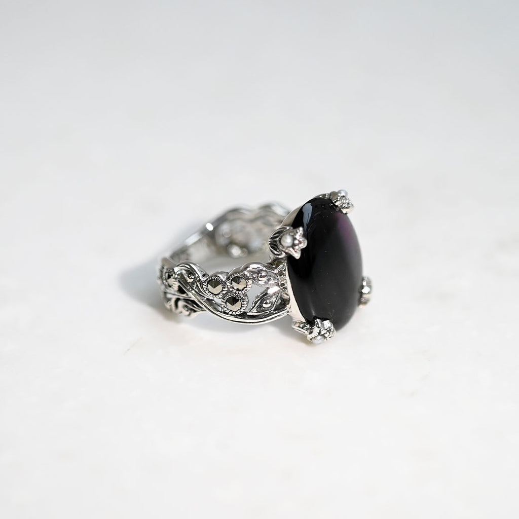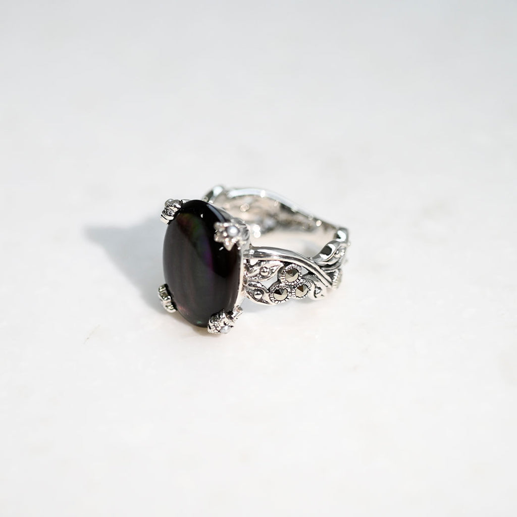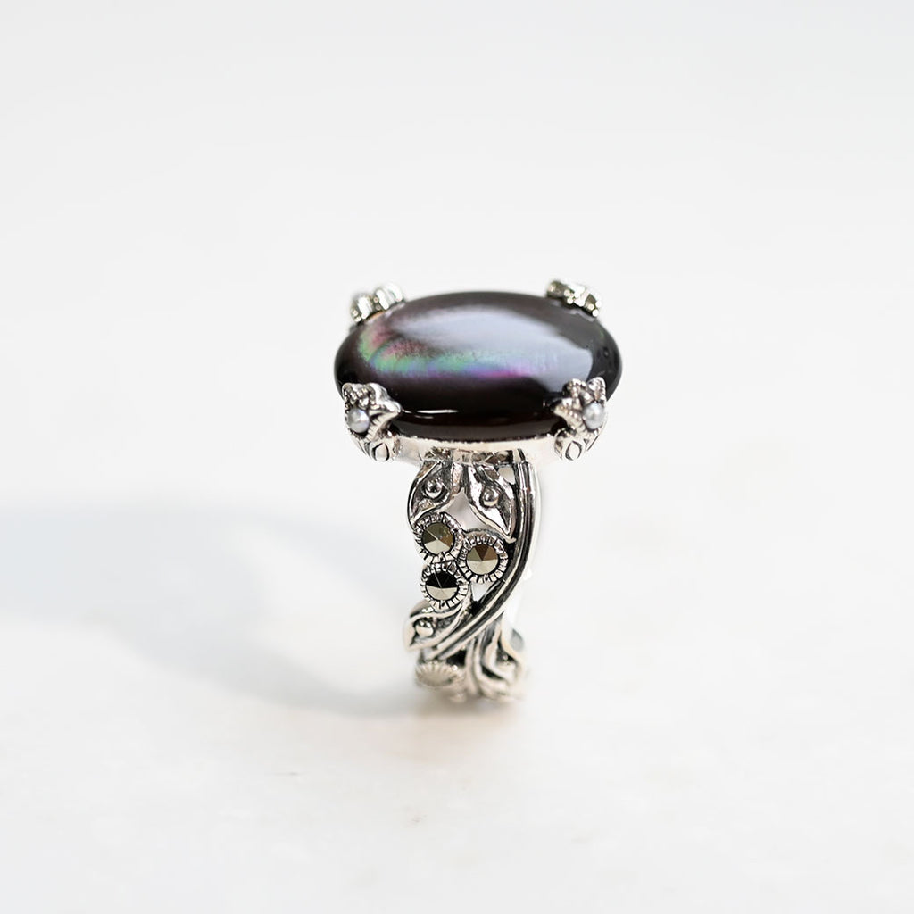 黒蝶貝の上に乗せた可憐なお花にはシードパールを留め、4点が黒蝶貝の周りで輝いています☆幅が広めのリングの腕にはしなやかに伸びる植物のラインを透かしや刻み模様などで描きマルカジットも添えて、とてもエレガントな印象に♡