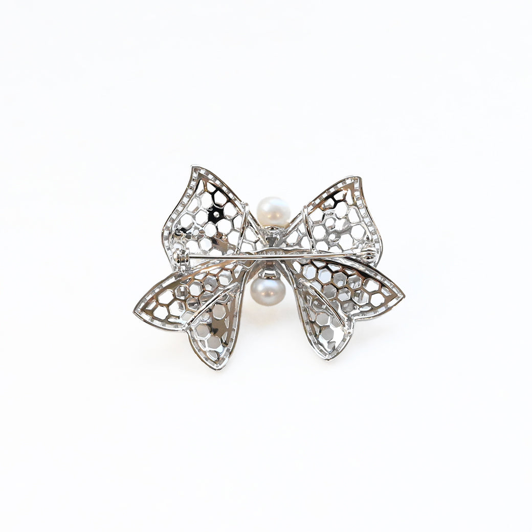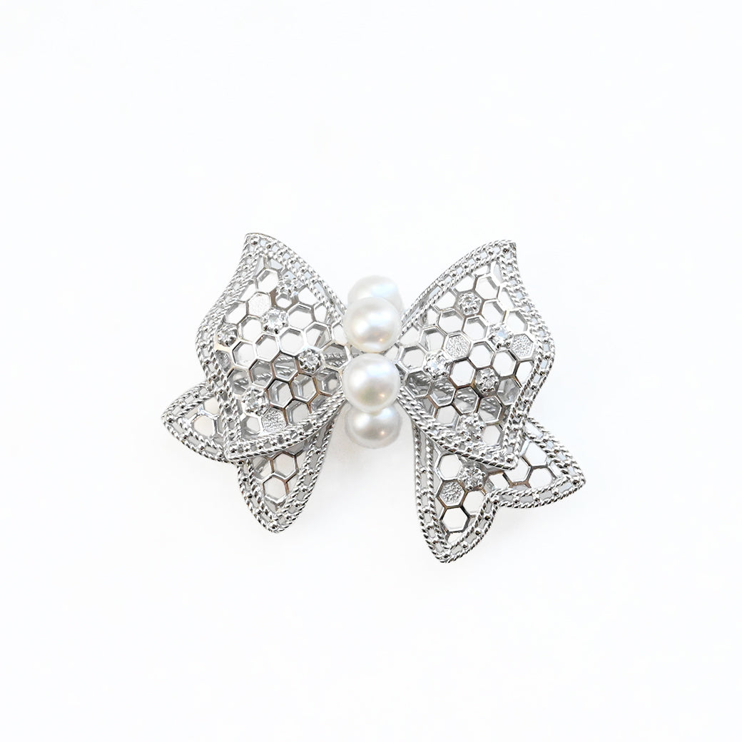 《ルバン・ミエル(フランス語で「蜂蜜のリボン」)》は、蜂の巣のように美しく整った透かし模様と、上品なリボンのフォルムが調和した、繊細なブローチです。