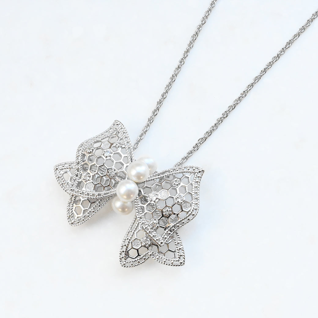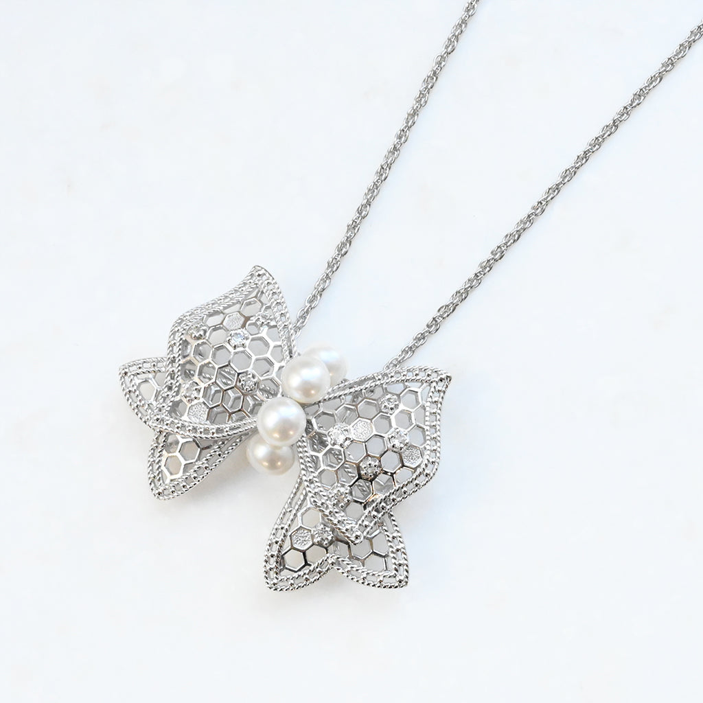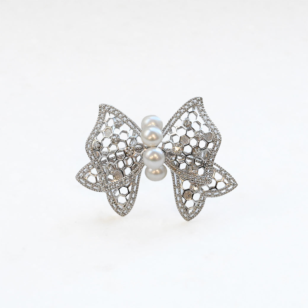 艶やかなパールが中央に3粒並び、まるで花の蜜を抱くように輝くホワイトトパーズが、光を受けてやさしくきらめきます。銀線細工のような繊細な縁取りと、奥行きのある透かしが、軽やかさと気品を同時に演出。フォーマルにも、ドレッシーなカジュアルにも合わせやすい万能なデザインです。