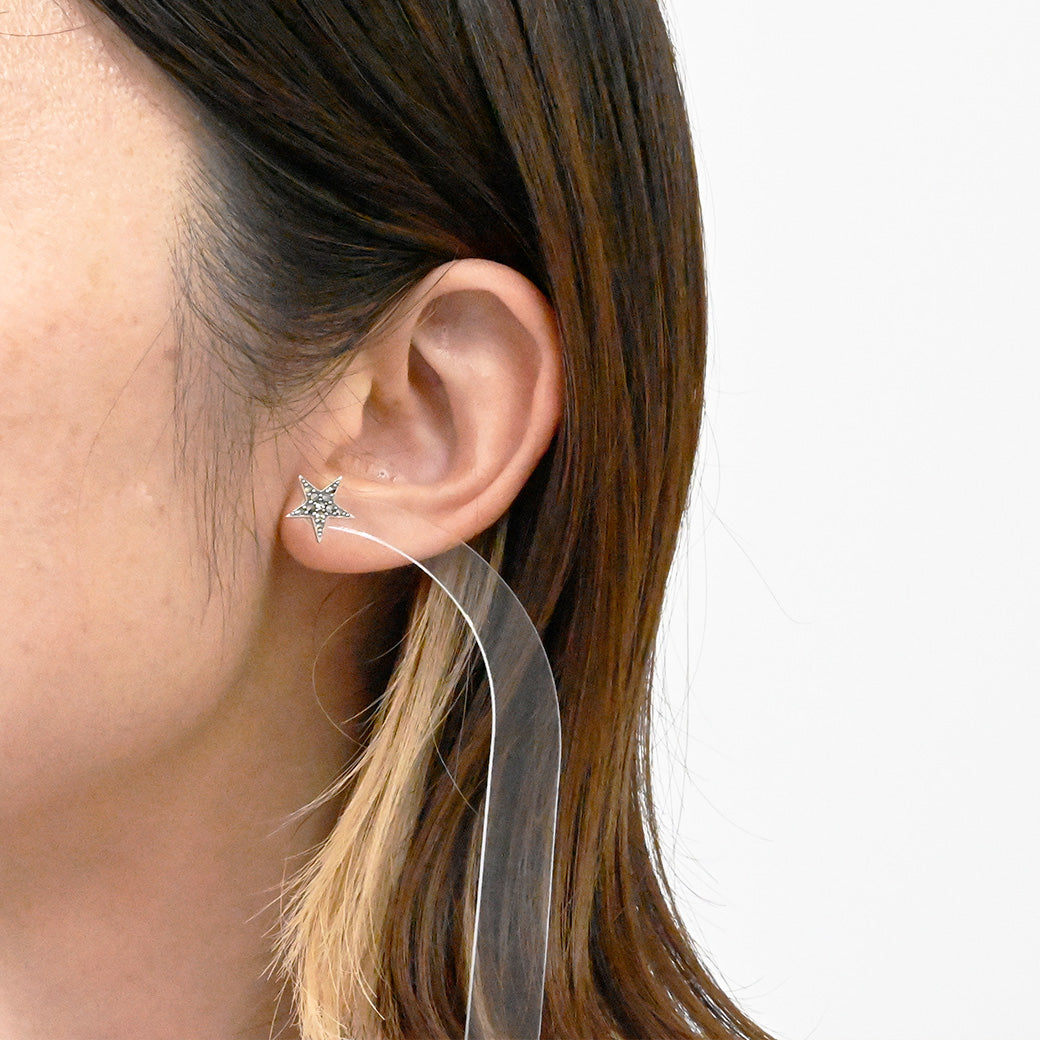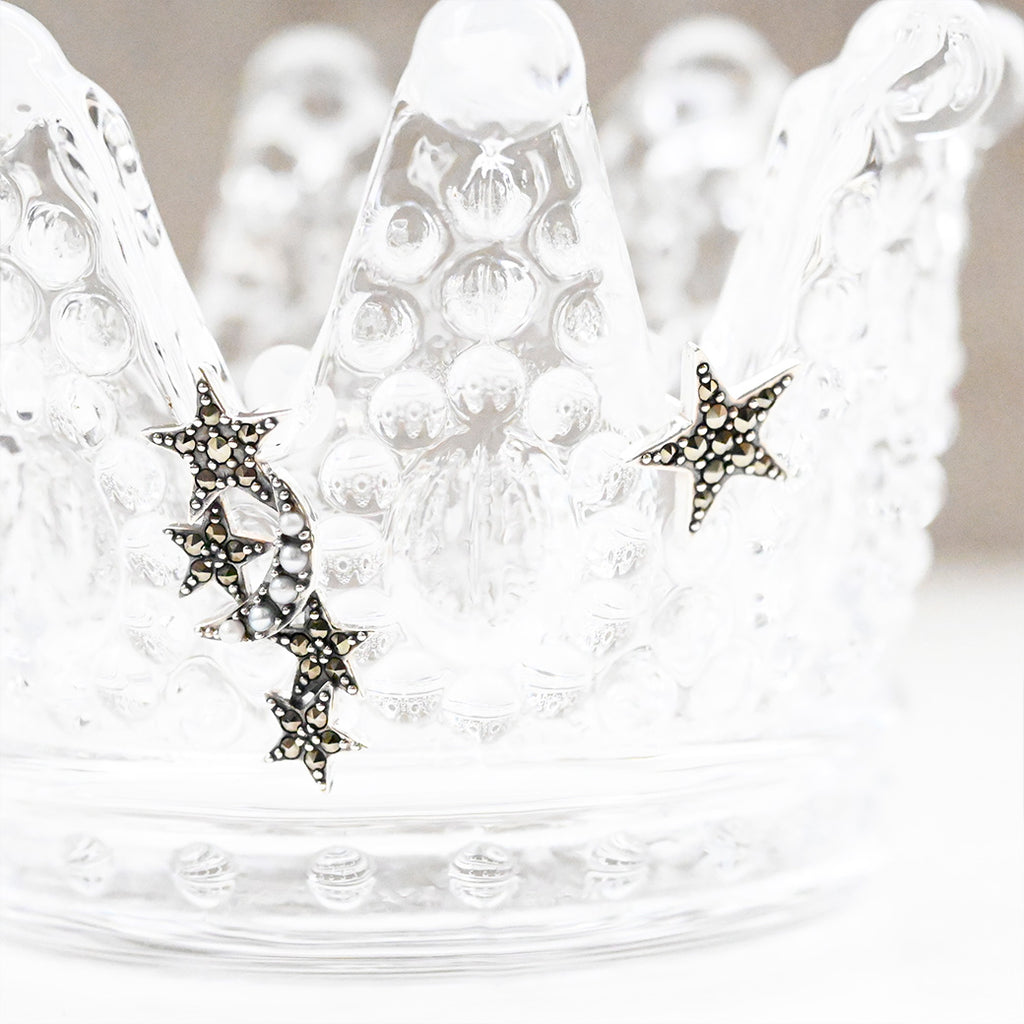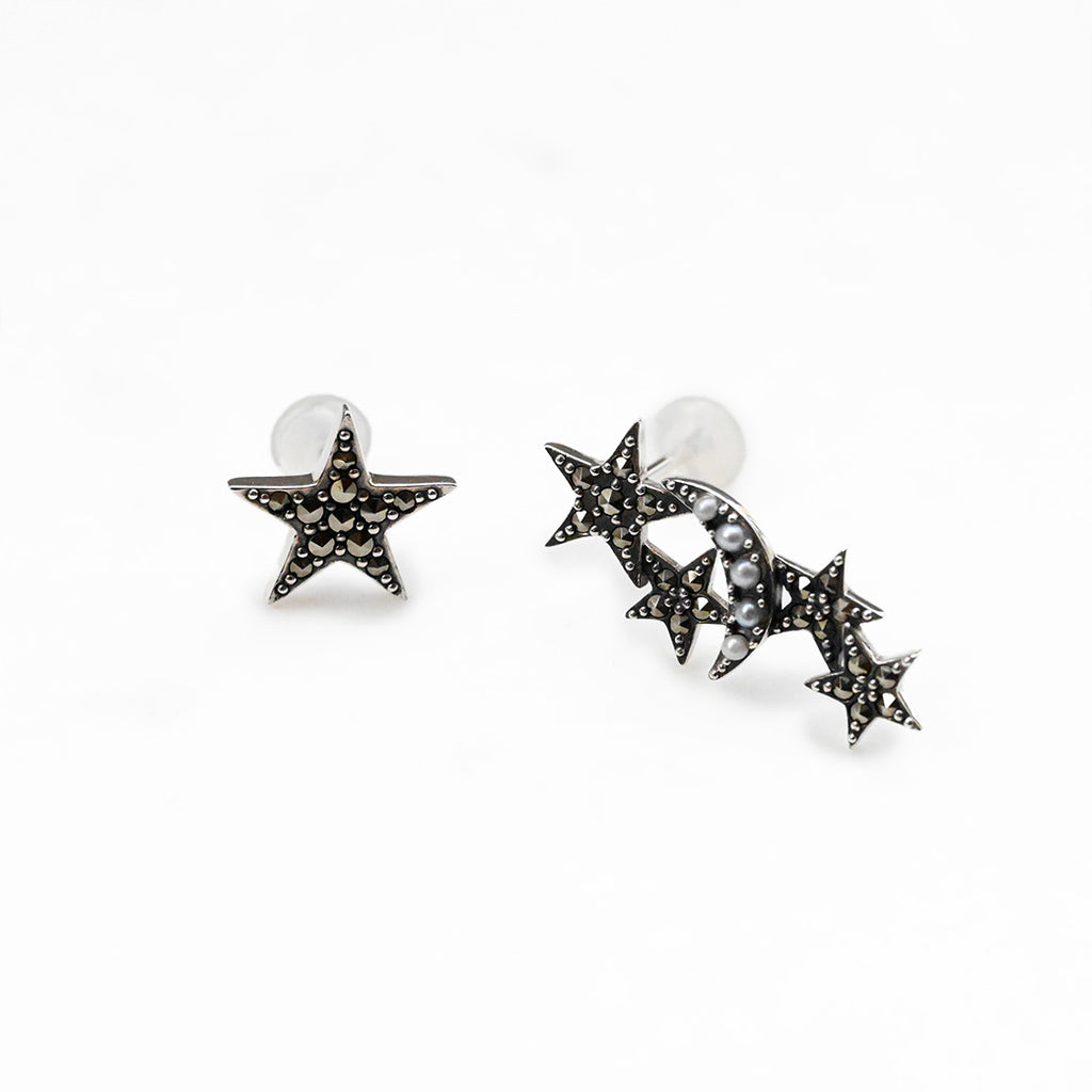 星と月にはマルカジットの輝きがちりばめられ、ミステリアスな光が耳元を彩ります。さらに、パールのさりげないアクセントが幻想的な雰囲気をプラス。