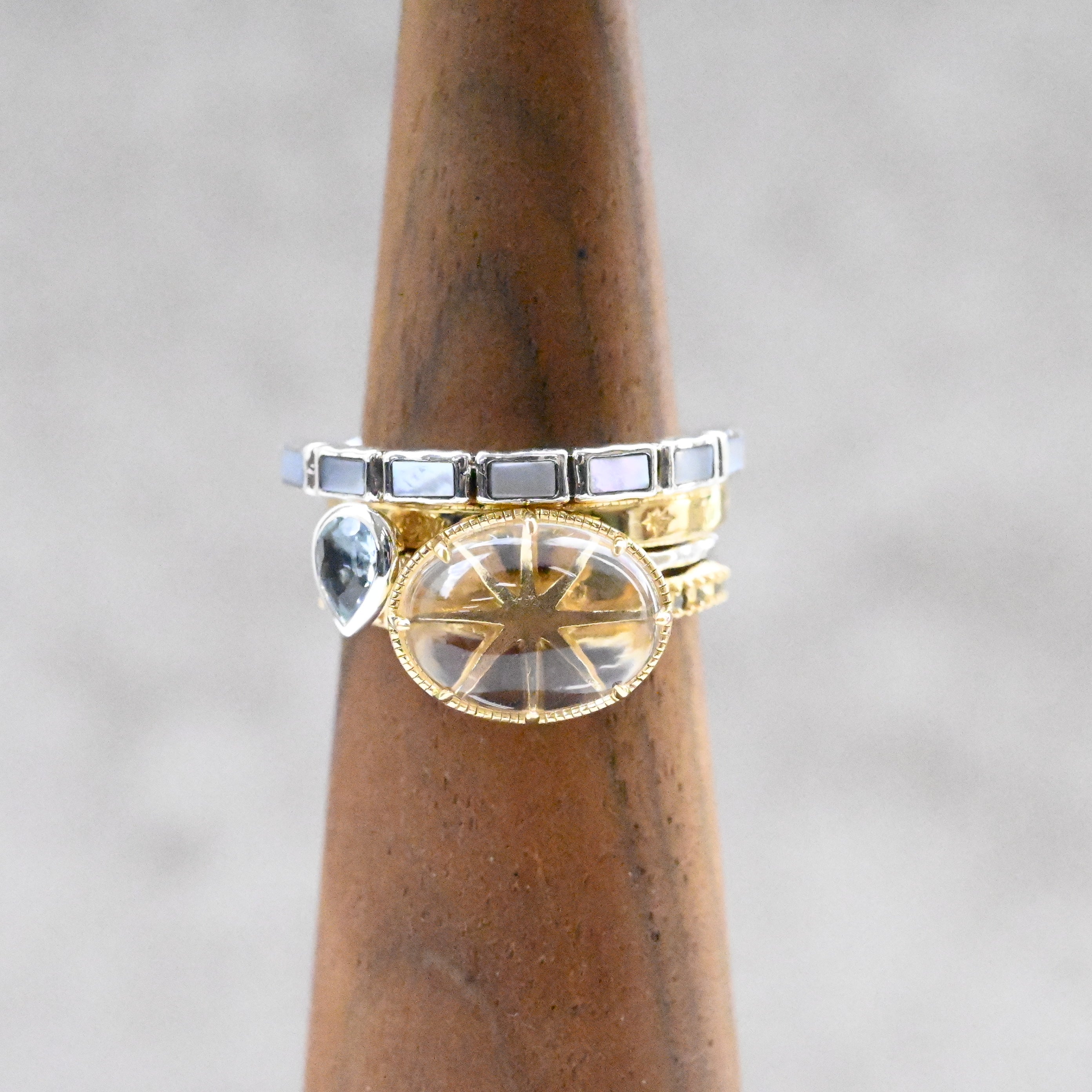 〈素材〉シルバー925(4本セット/ゴールドメッキ含む)〈石〉クリスタル・アクアマリン・白蝶貝・マルカジット〈サイズ調整〉不可※FATRAS台紙・瓶包装は付属品ではございません。(台紙ご希望の方はチャットにてお問い合わせください)※ブローチペンダント、ペンダントと表記がございますものは、真鍮サービスチェーンをお付けします。(リング、イヤリング、ピアス、K18、K10商品には付属しません。)■ご購入前にご確認ください※天然石を使用している為、色や形に多少の個体差があること、また、ブラウザによって実際の色味に若干差が出ますことをご了承ください。※撮影小物は付属いたしません。※商品の仕様変更、石変更は承っておりません。※ご注文後のお客様都合による返品・交換(サイズやイメージ違いなど)は承っておりません。不良品のみ返品を承ります。詳しくはこちら※着け心地や重さ等、その他ご不明な点はチャットにてお問い合わせくださいませ。